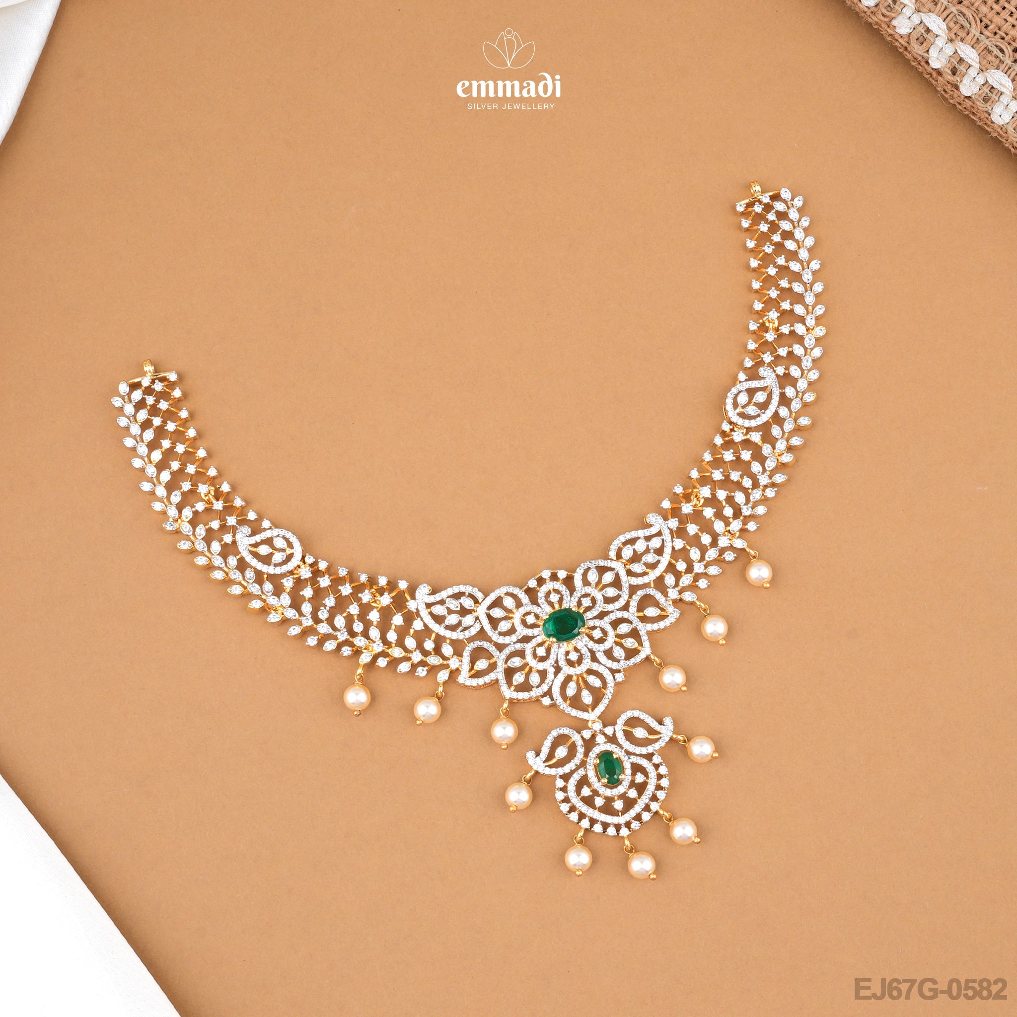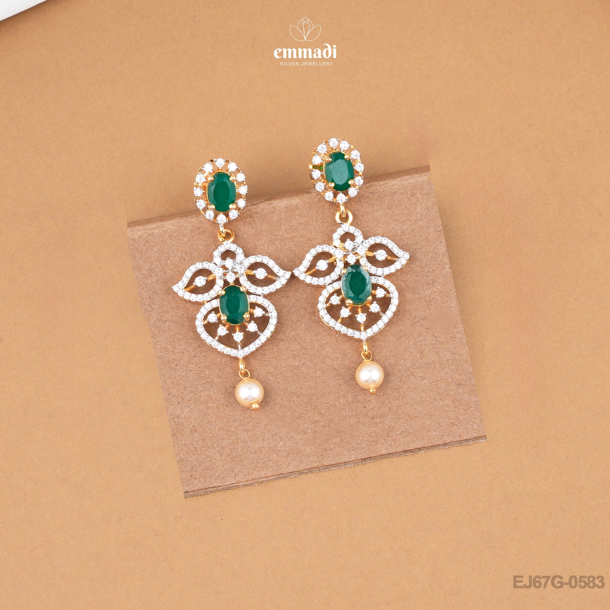 Crafted with meticulous attention to detail, the necklace and hangings are designed to reflect light beautifully, enhancing their overall allure. The intricate design of the necklace includes a central pendant adorned with a brilliant green cubic zirconia, surrounded by smaller clear stones that amplify its charm. Meanwhile, the hangings are lightweight and comfortable, allowing you to flaunt them all day long without discomfort.