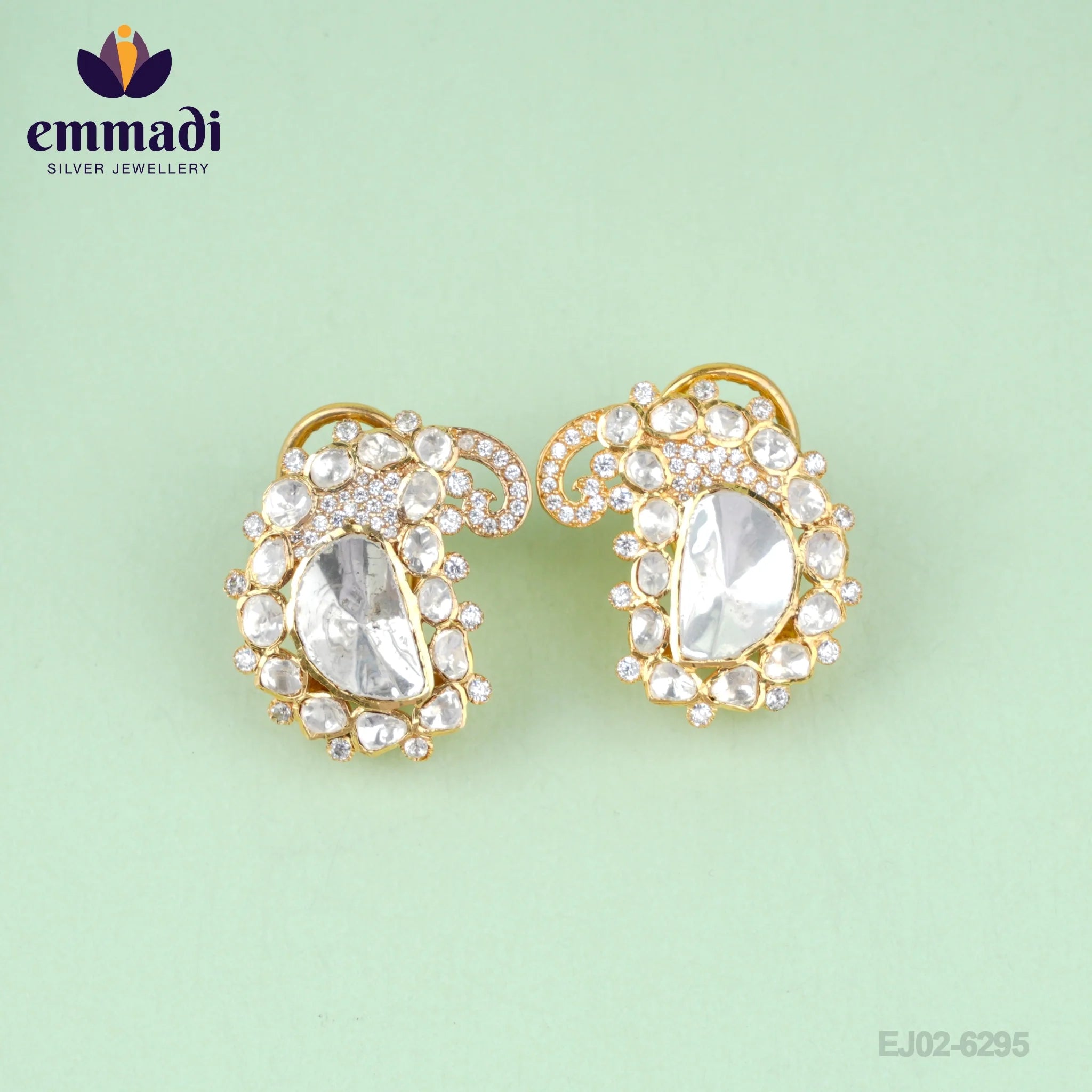 Gaganjyoti Handcrafted Ear Tops: Moissanite Studs are exquisite pieces of jewelry meticulously crafted by Emmadi Jewellers using 92.5 silver and pure gold plating. These stunning ear tops are adorned with shimmering moissanite stones that replicate the brilliance of diamonds, adding a touch of elegance to any outfit.