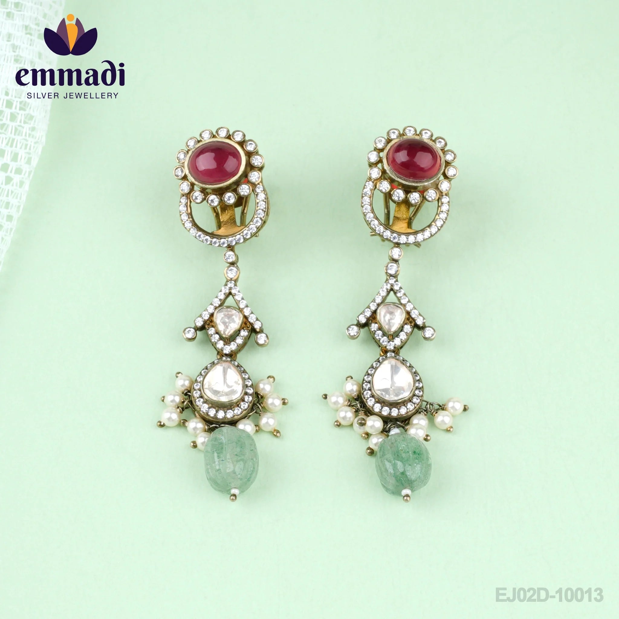 Emmadi Jewellers presents their exquisite line of handcrafted earrings, the Hangings Victorian Red collection. These stunning earrings are made with 92.5 silver and feature pure gold plating, adding a touch of opulence to any outfit.