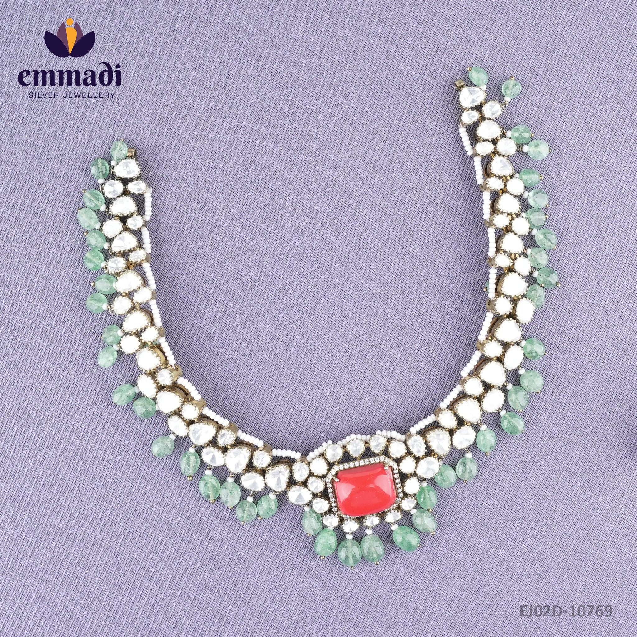 Indulge in the timeless elegance of the Reva Victorian Coral Necklace by Emmadi Silver Jeweller, India's Largest silver brand. Elevate your style with this exquisite piece, exuding opulence and sophistication with its intricate design and vibrant coral hue. Crafted with meticulous attention to detail, this necklace is a true masterpiece that effortlessly combines vintage charm with a modern twist. Make a statement and dazzle on any occasion with this luxurious accessory that is sure to turn heads and leave a lasting impression.