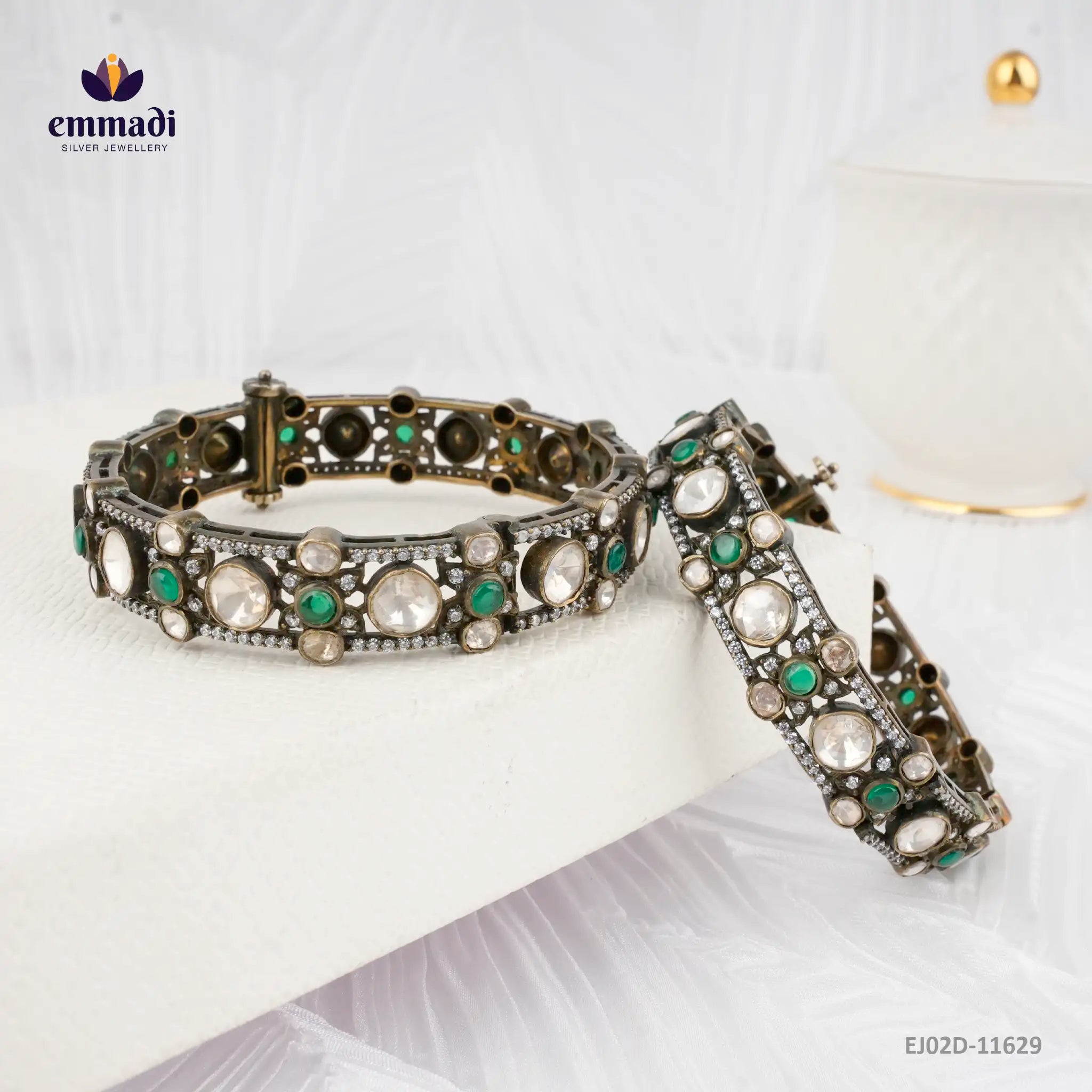 Indulge in the epitome of sophistication with the magnificent Sima Victorian Green Bangles by Emmadi Silver Jewellery, India's Largest Silver Brand. Crafted with a timeless Victorian design and adorned with captivating green accents, these exquisite bangles exude opulence and elegance effortlessly. Elevate your ensemble to a whole new level of luxury with these dazzling statement pieces. Embrace the allure of timeless beauty with the Sima Victorian Green Bangles.