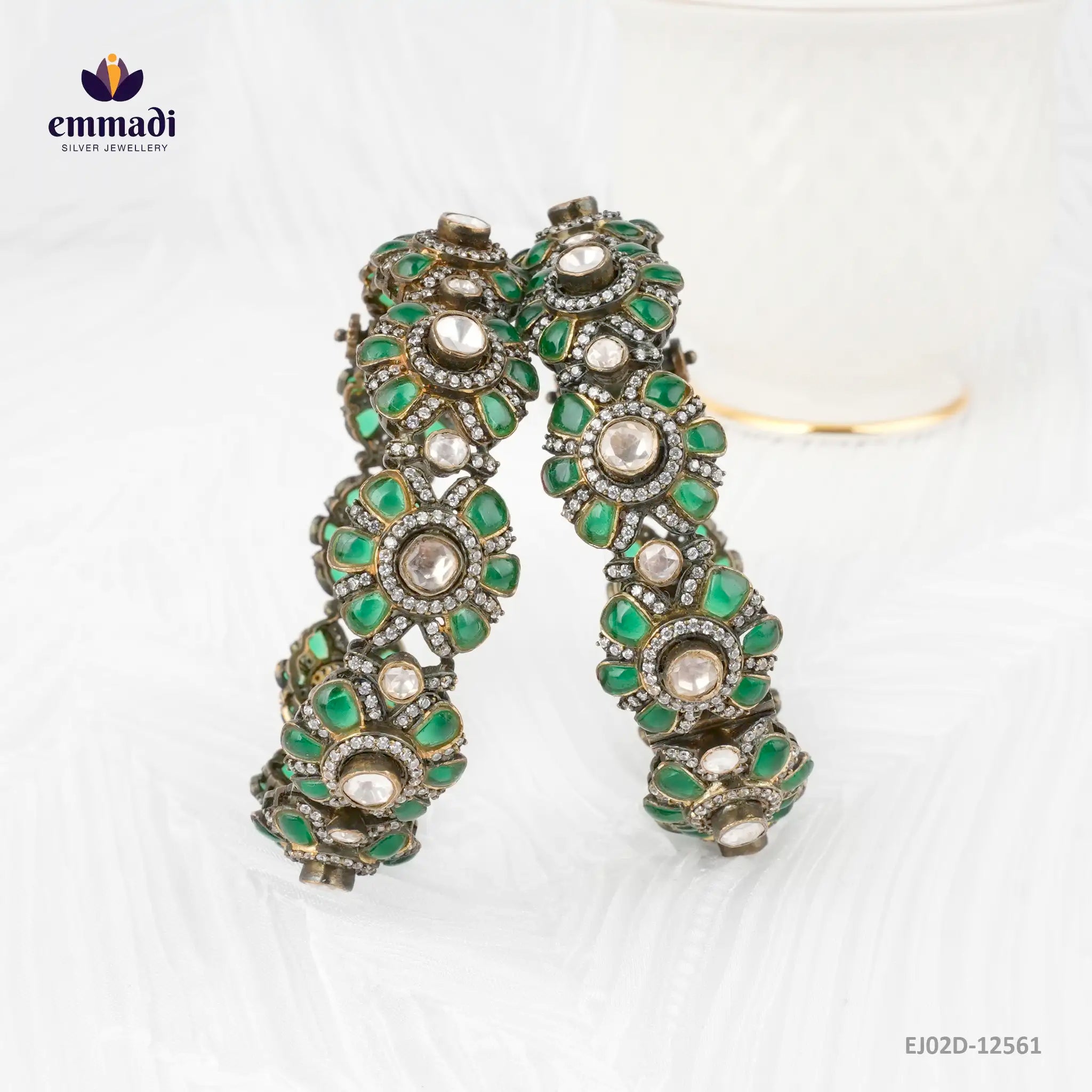 Indulge in the epitome of opulence with the Tosa Victorian Green Bangles by Emmadi Silver Jewellery, India's Largest Silver Brand. Adorn your wrists with the essence of Victorian charm and sophistication. Crafted with intricate detail and a lush green hue, these bangles exude luxury beyond compare. Elevate your ensemble to new heights, embodying timeless elegance and refinement with every wear. Experience the allure of unparalleled craftsmanship and timeless beauty with these exquisite statement pieces that defy the constraints of passing trends.