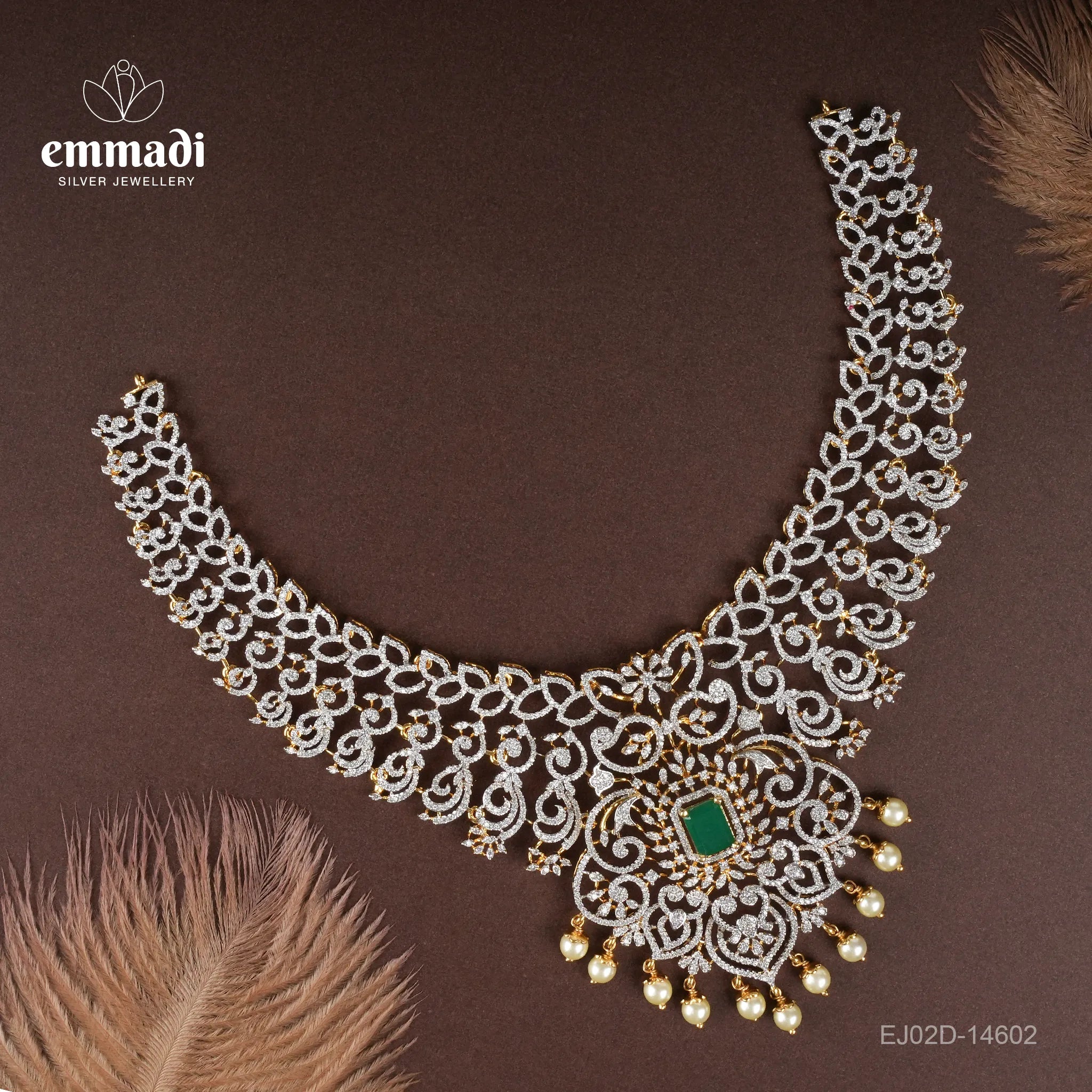 Indulge in elegance with the Yuga Premium CZ Green Necklace by Emmadi Silver Jeweller, India's Largest silver brand. This exquisite piece exudes sophistication and glamour, perfect for adding a touch of luxury to any outfit. Elevate your style with this stunning green necklace that will surely make you stand out from the crowd. Cherish the beauty of craftsmanship and make a statement of opulence with this premium accessory.