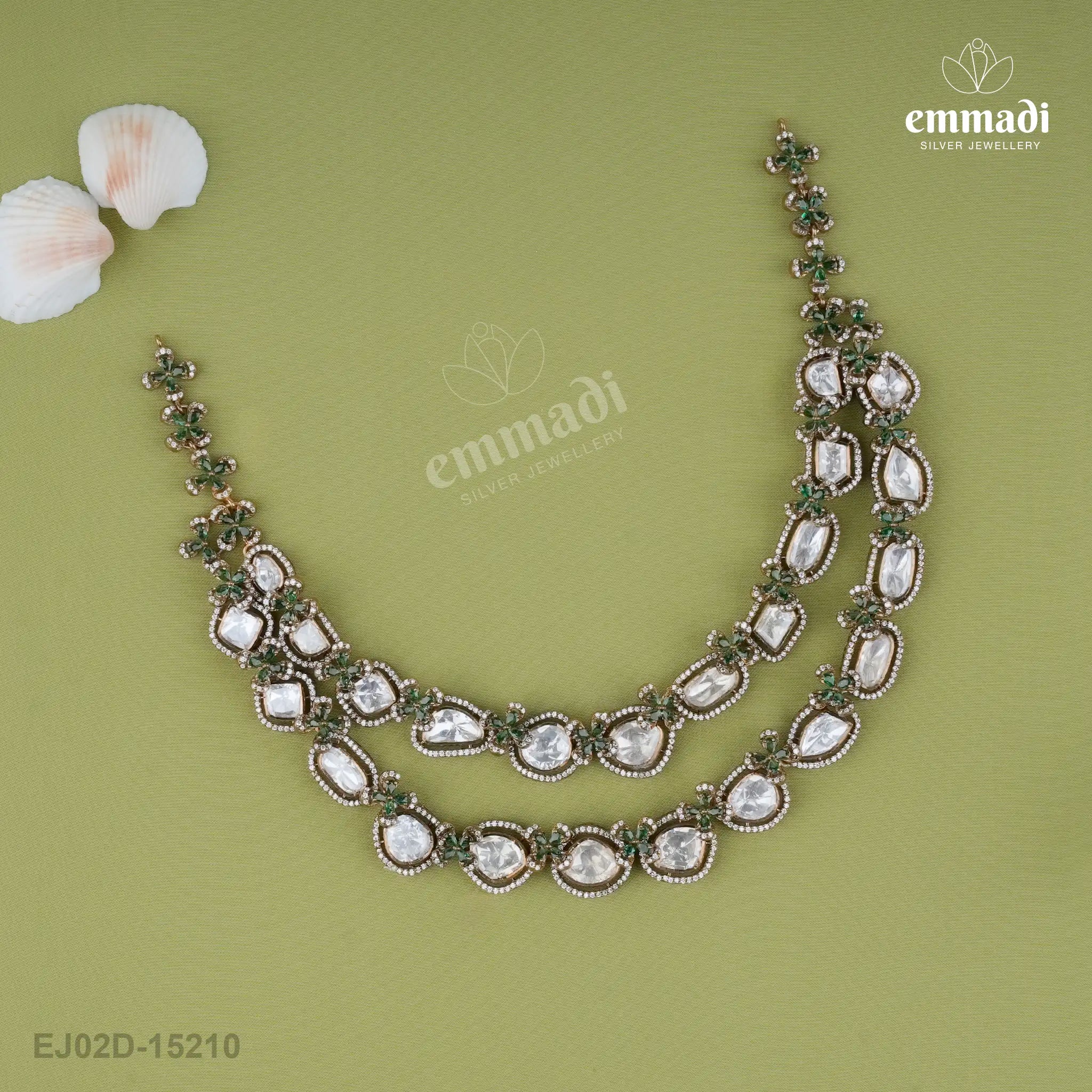 Indulge in the exquisite beauty of the Aasha Victorian Green Necklace from Emmadi Silver Jeweller, India's Largest silver brand. Crafted with intricate details and adorned with a stunning green gem, this piece exudes opulence and sophistication. Elevate your look with this timeless necklace that effortlessly combines traditional elegance with modern charm.