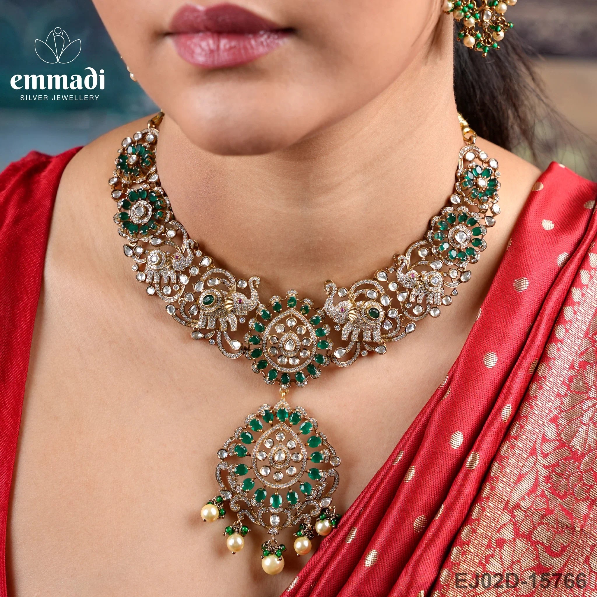 Indulge in the exquisite allure of the Bhima Victorian Green Necklace, a true masterpiece crafted by Emmadi Silver Jeweller, India's largest silver brand. This stunning piece exudes opulence and sophistication, effortlessly elevating any ensemble to royal heights. Let the rich green hues and intricate Victorian design adorn your neckline with timeless elegance. Elevate your style and grace with this luxurious statement piece.