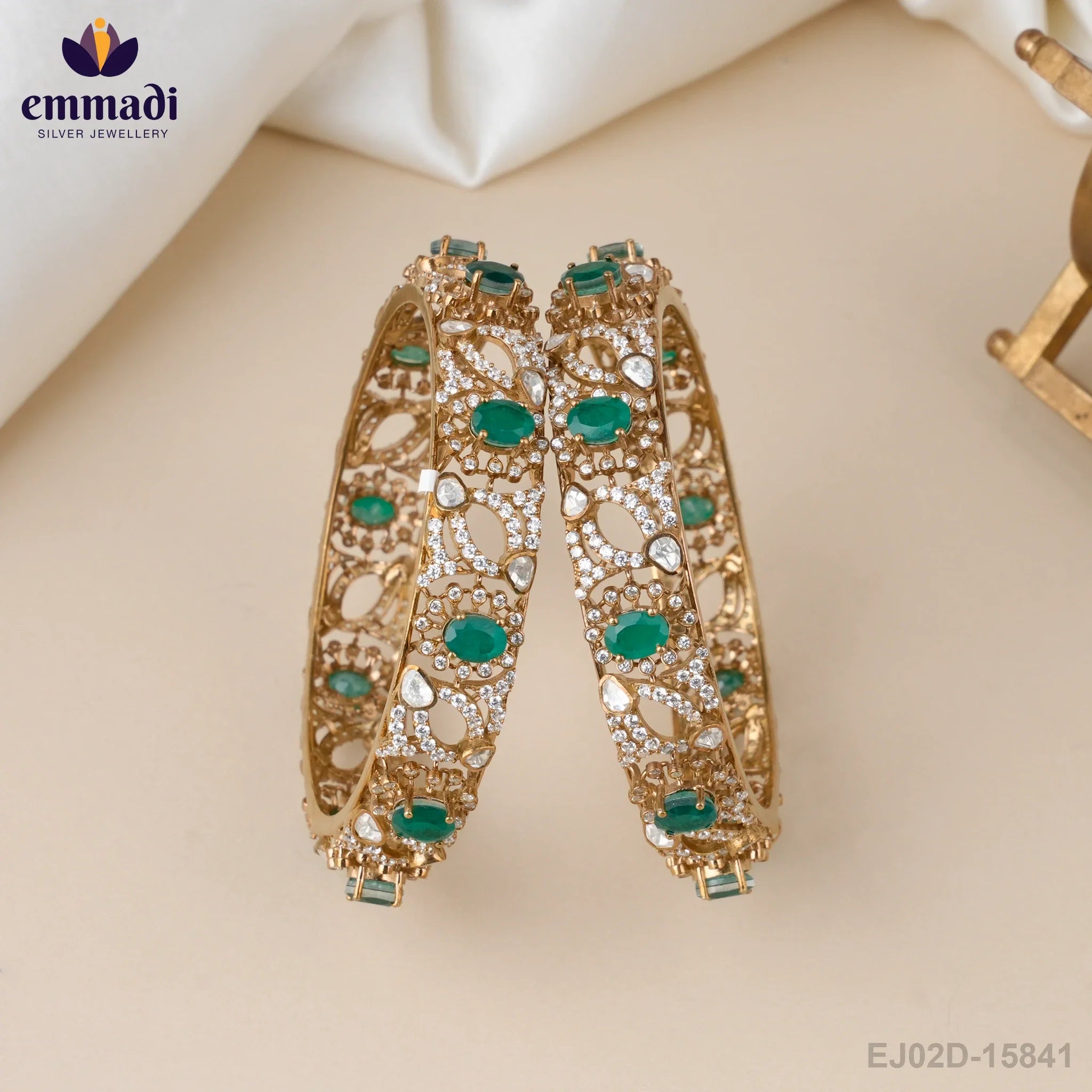 Step into a world of luxury with the magnificent Dhira Victorian Green Bangles by Emmadi Silver Jewellery, India's Largest Silver Brand. Transport yourself to a bygone era as you adorn your wrists with these opulent bangles, dripping in regal charm with vibrant green stones. Elevate your style with a touch of royal splendour, merging tradition and modern glamour seamlessly. Embrace the timeless beauty and grace of these exquisite bangles, making a statement that exudes sophistication and elegance. Experience the allure of the past while basking in the glow of contemporary allure.