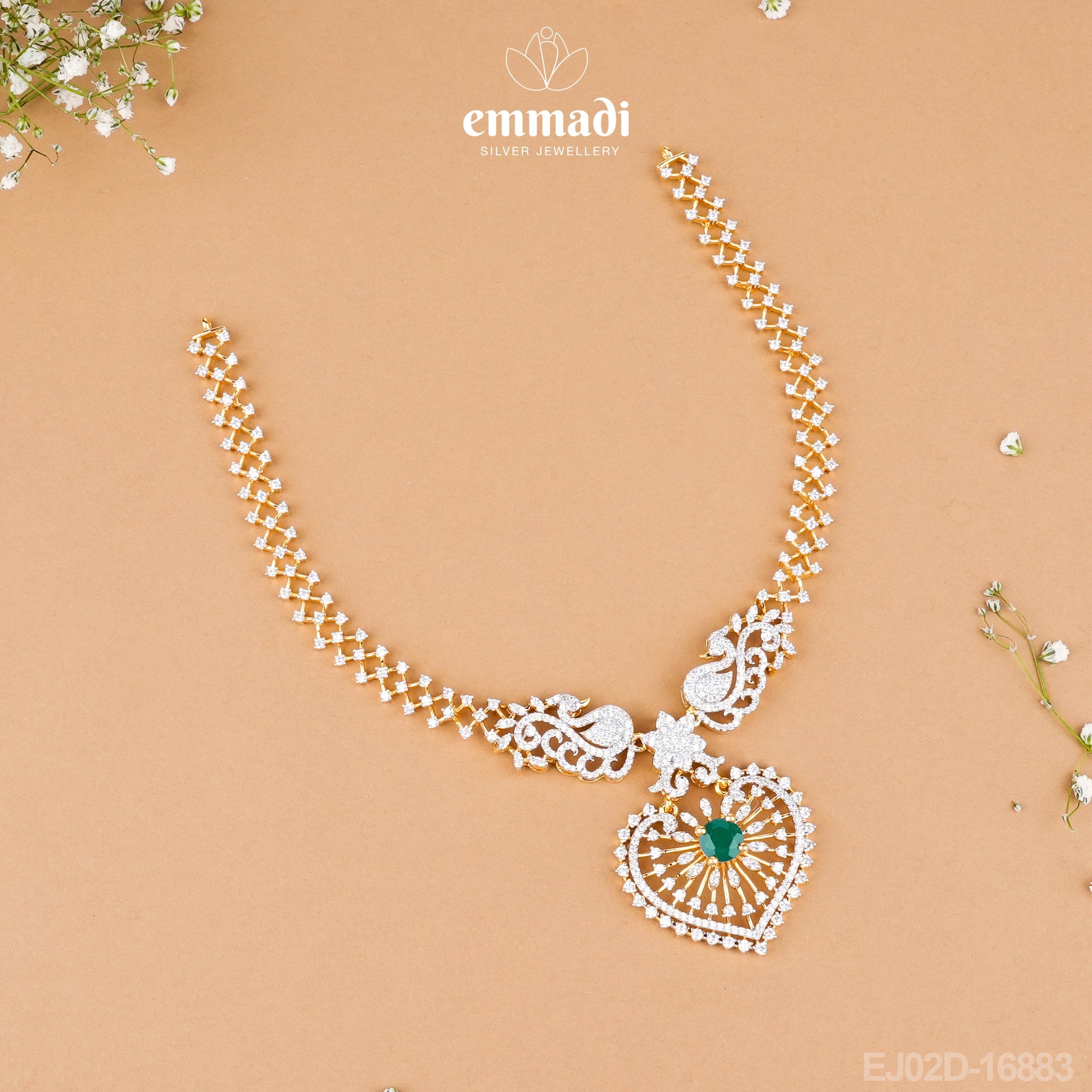 Introducing Surjeet's Premium Green CZ Necklace, a stunning piece that embodies elegance and sophistication. Handcrafted with meticulous care, this exquisite necklace features a vibrant green cubic zirconia stone that catches the light beautifully, making it a true statement accessory. The necklace is designed by the renowned designer Emmadi, renowned for his ability to blend contemporary design with timeless style.
