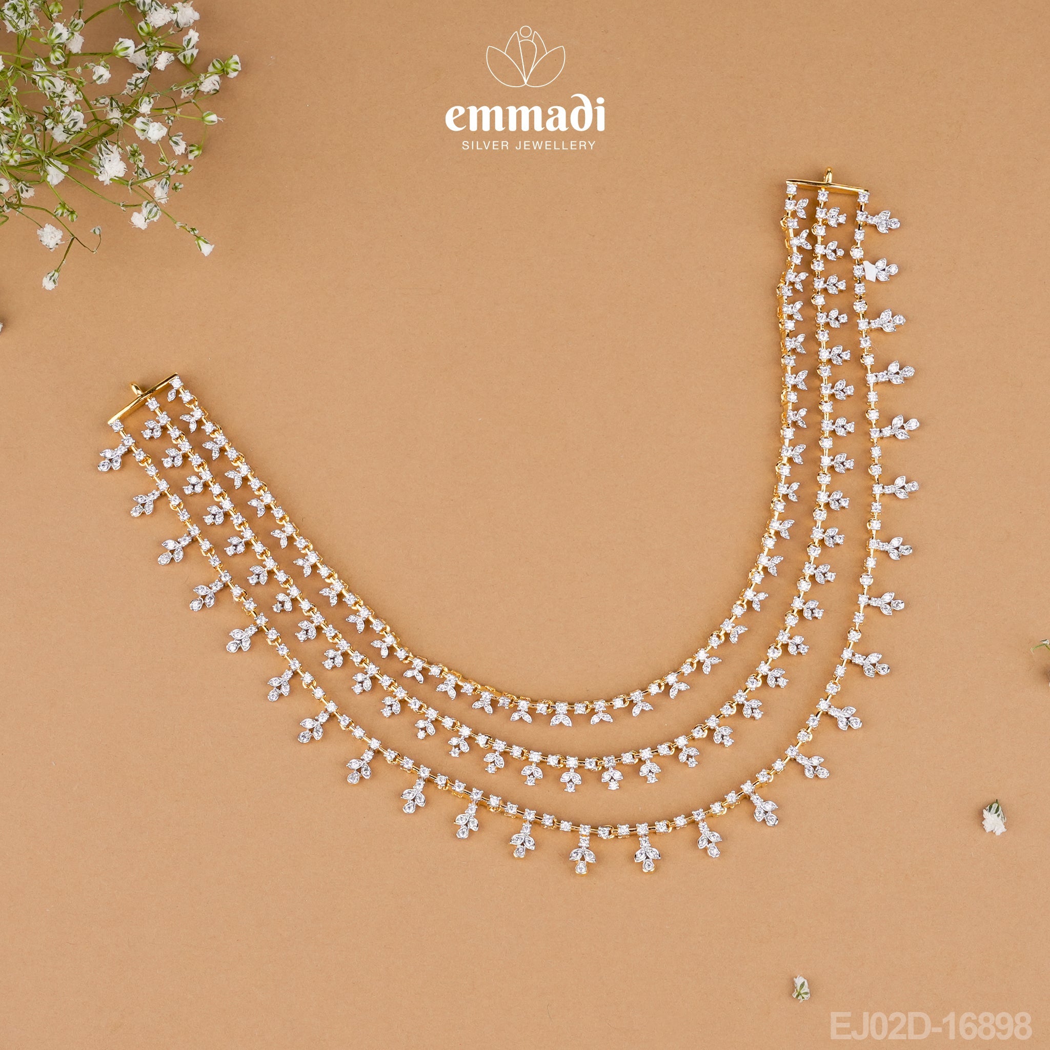Constructed from pure 92.5 silver, this necklace is adorned with pure gold plating that adds to its opulence while ensuring that it remains a statement piece. It's important to note that this necklace is delicately designed and is not intended for daily wear, allowing it to retain its pristine condition over time. Each piece is carefully crafted by the renowned designer Emmadi, known for her attention to detail and commitment to quality.