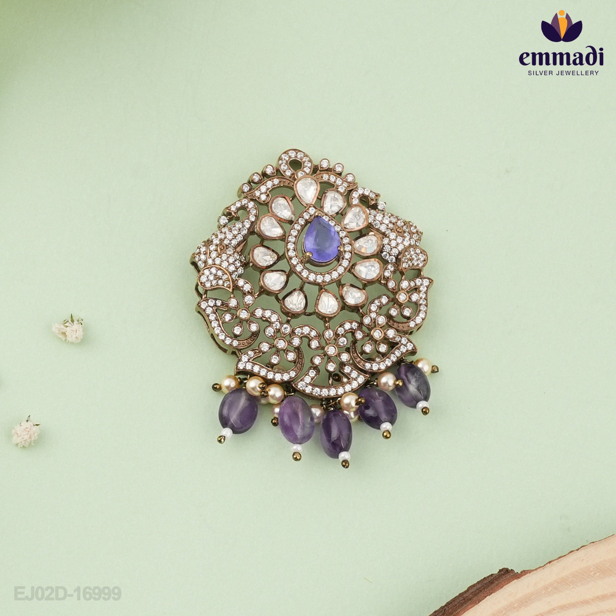 Discover the exquisite Sapana Victorian Blue Stone Pendant, a stunning piece of jewelry that embodies elegance and sophistication. This handcrafted pendant features intricate Victorian designs, meticulously crafted from pure 92.5 silver and lavishly plated with gold. The centerpiece of the pendant is a captivating blue stone that enhances its vintage charm and adds a pop of color to any outfit. With its timeless aesthetic, this pendant serves as a striking accessory for special occasions, making it an ideal choice for formal events, celebrations, or simply to elevate your ensemble.