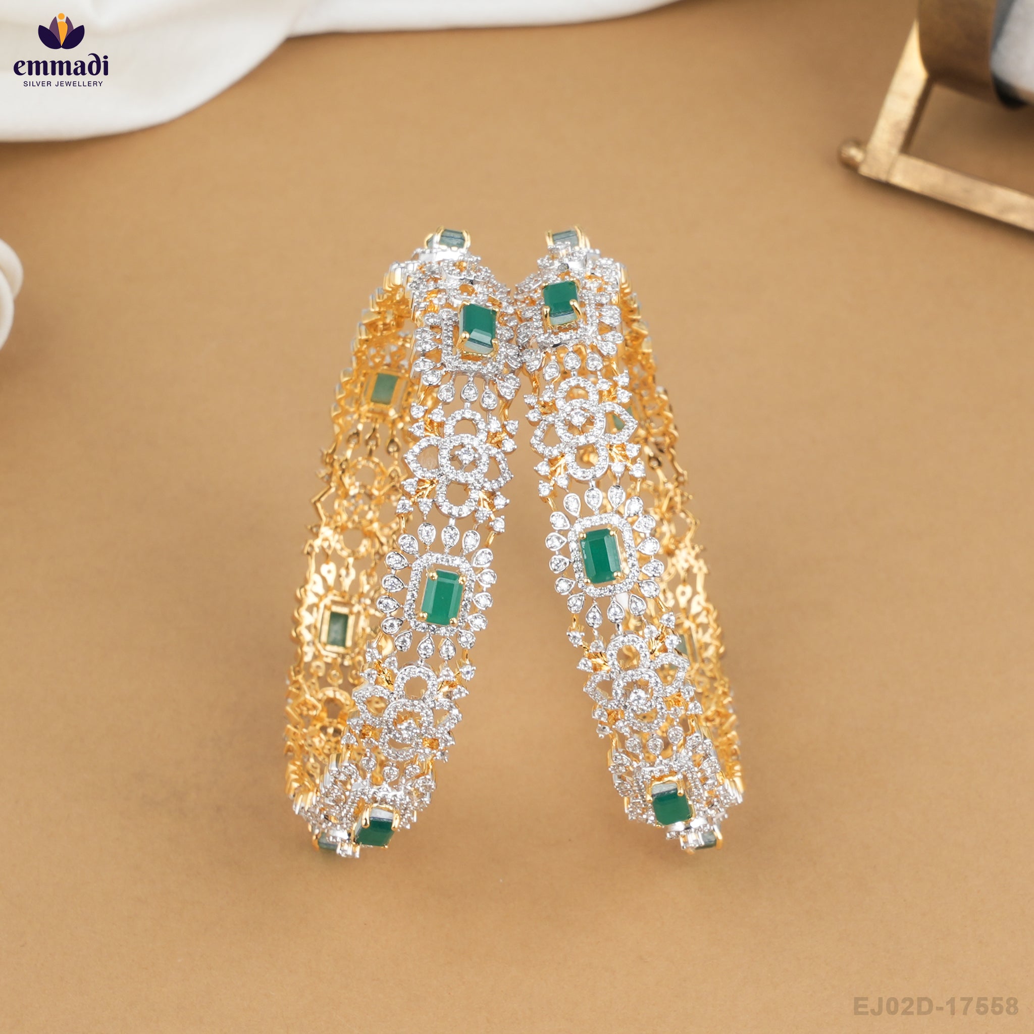 Crafted with meticulous attention to detail, each bangle features an intricate design that beautifully showcases the vibrant green cubic zirconia stones. The dazzling stones are expertly set, allowing them to catch and reflect light, creating a brilliant sparkle. The green hue symbolizes harmony and renewal, making these bangles both a stylish and meaningful addition to your jewelry collection.