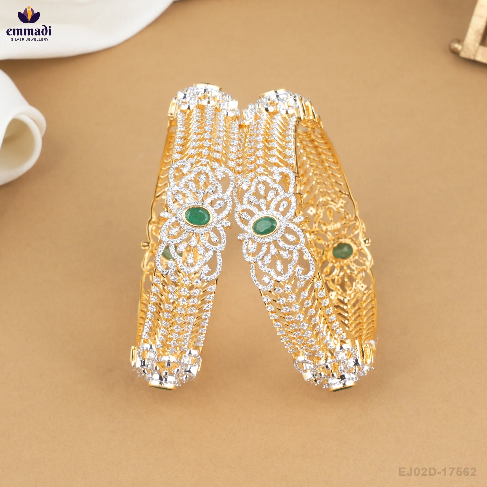 Each bangle is adorned with high-quality cubic zirconia (CZ) stones, known for their brilliance and durability, ensuring a dazzling sparkle that rivals natural gemstones. The green stones are set in a meticulously designed framework that complements the overall aesthetic, creating a harmonious look that is both vibrant and sophisticated.