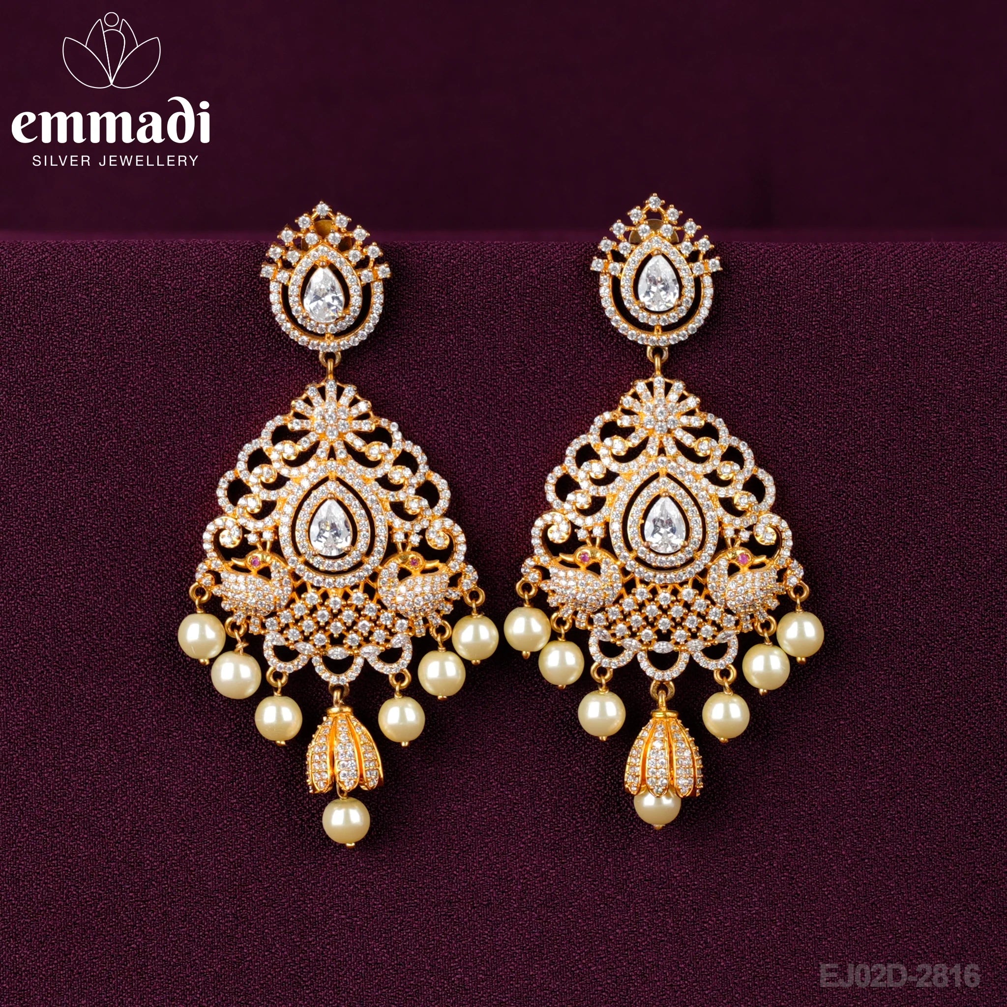 Moksha Jewellery presents a stunning collection of handcrafted earrings with pure gold plating on 92.5 silver, adorned with CZ white stones. Each pair of earrings is meticulously designed and crafted by Emmadi Jewellers, known for their exquisite craftsmanship and attention to detail.