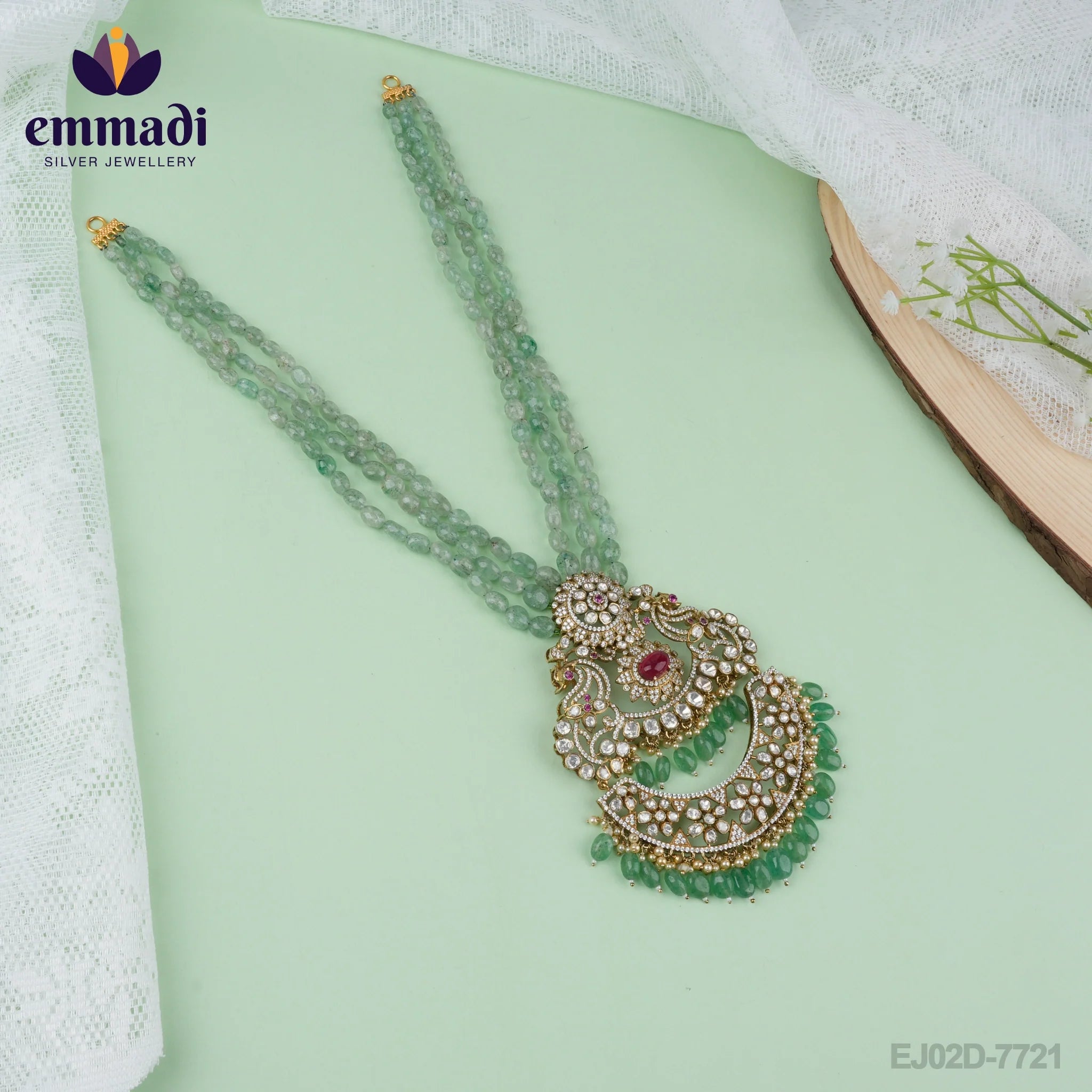 Emmadi Jewellers brings you the exquisite Saubhagya Handcrafted Long Necklace, featuring stunning design and intricate details. Made with 92.5 silver and pure gold plating, this timeless piece is a true work of art.