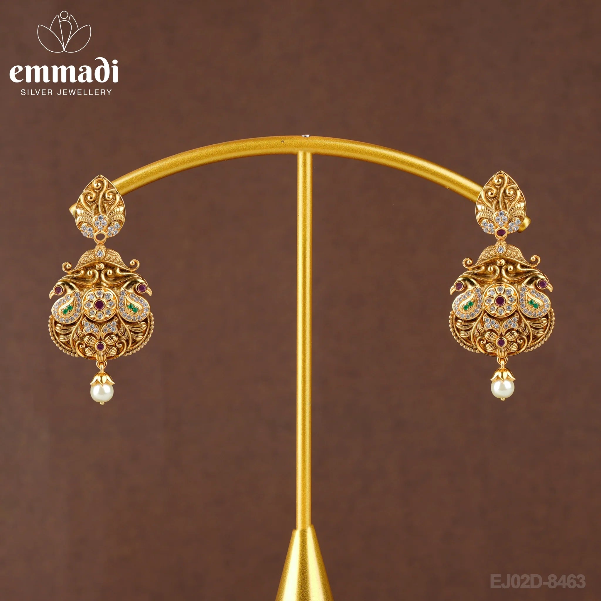 Moksha Handcrafted Gold Plated Hangings are exquisitely designed jewelry pieces made by Emmadi Jewellers using 92.5 silver and pure gold plating. These premium antique hangings are perfect for special occasions and events, adding a touch of elegance and glamour to any outfit.