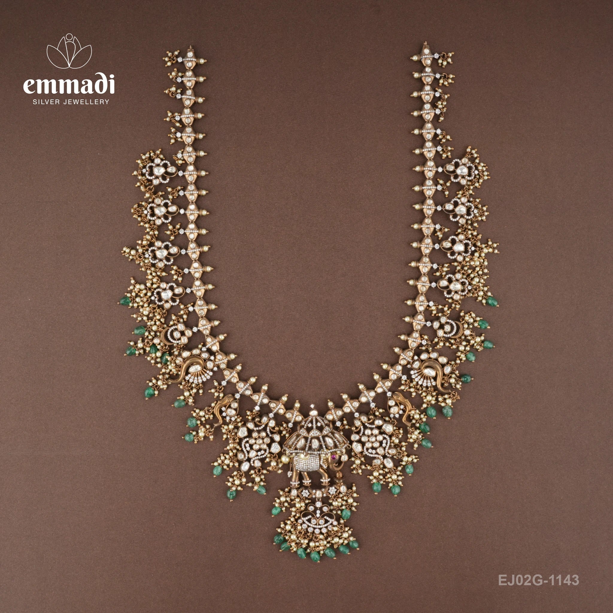 Indulge in the timeless elegance of the Champa Victorian Pink Long Necklace, crafted by Emmadi Silver Jeweller, India's Largest silver brand. Adorn yourself with this exquisite piece that exudes opulence and sophistication. Elevate your style effortlessly with this luxurious necklace that is sure to make a statement wherever you go. Immerse yourself in the beauty of Victorian-inspired design and enhance your ensemble with a touch of grace and glamour. Unleash your inner royal with the captivating Champa Victorian Pink Long Necklace.