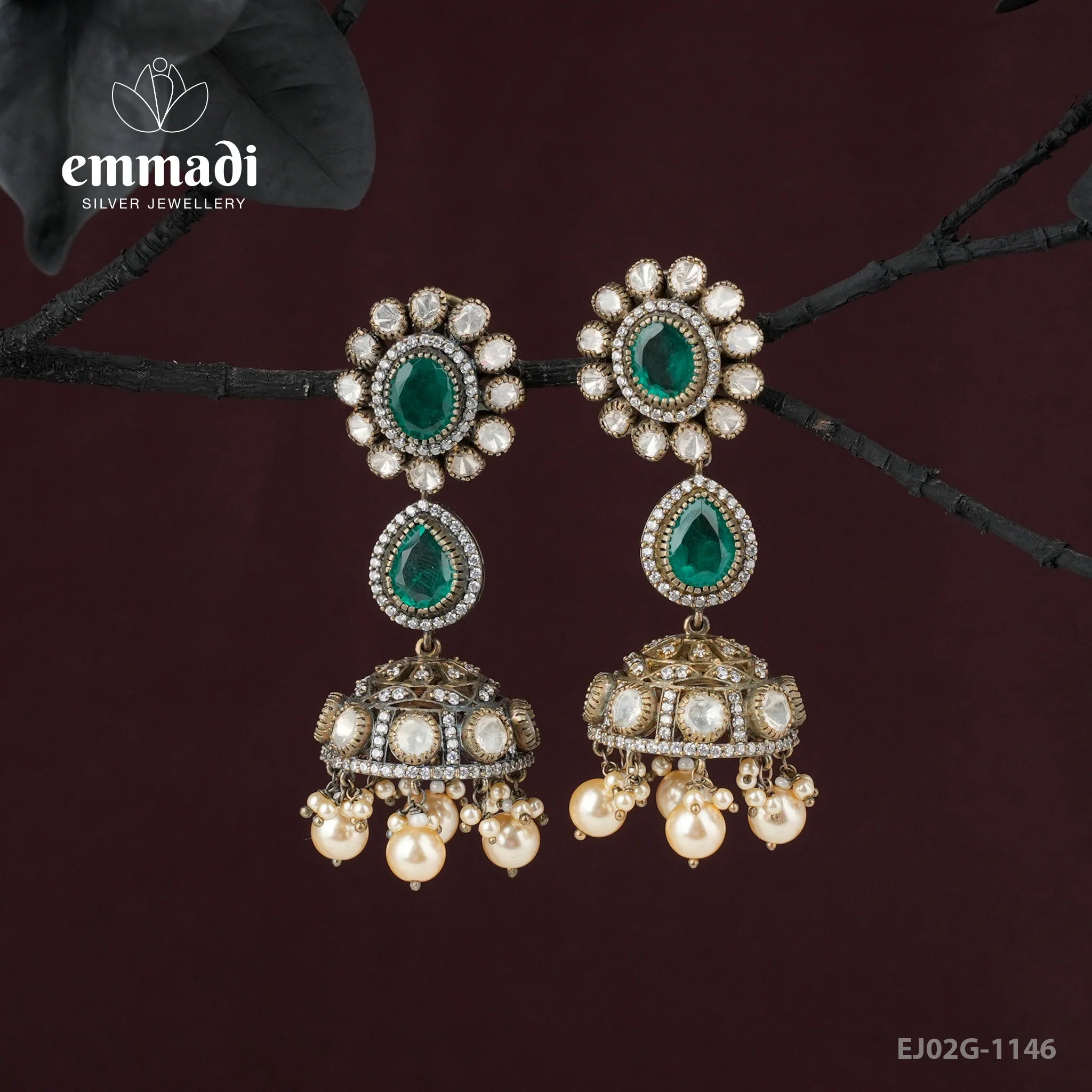 Indulge in the exquisite elegance of the Chanya Victorian Green Buttalu by Emmadi Silver Jeweller, India's Largest silver brand. ���� Adorn yourself with the regal charm of these intricate earrings, a true testament to luxury and sophistication. With a captivating Victorian design and a mesmerising green hue, these Buttalu are sure to captivate all admirers. Elevate your style to royalty with these finely crafted masterpieces.