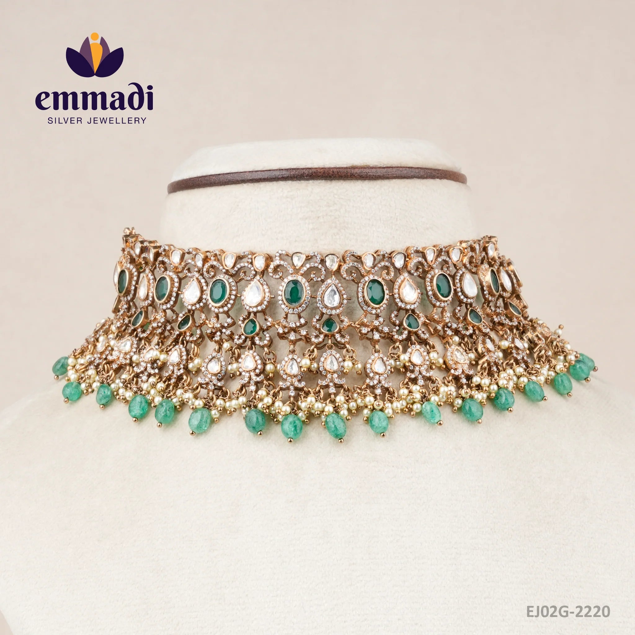 Indulge in the timeless elegance of the Kiruba Victorian Green Choker by Emmadi Silver Jeweller, India's Largest silver brand. This exquisite piece exudes opulence and sophistication, perfect for the modern-day queen with a taste for luxury. Adorn yourself with this stunning choker to make a statement at any special occasion. Elevate your jewellery collection with this captivating masterpiece.