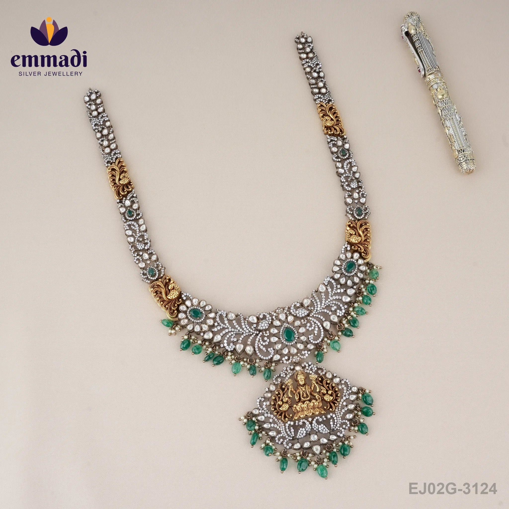 Indulge in the opulent beauty of the Sahana Victorian Green Long Necklace by Emmadi Silver Jeweller, India's Largest silver brand. Adorn yourself with this exquisite piece that exudes Victorian charm and sophistication. The lush green hue of the necklace adds a touch of elegance to any outfit, making it the perfect accessory for those who appreciate luxury and timeless style. Elevate your ensemble with the regal allure of this majestic necklace and make a statement wherever you go.