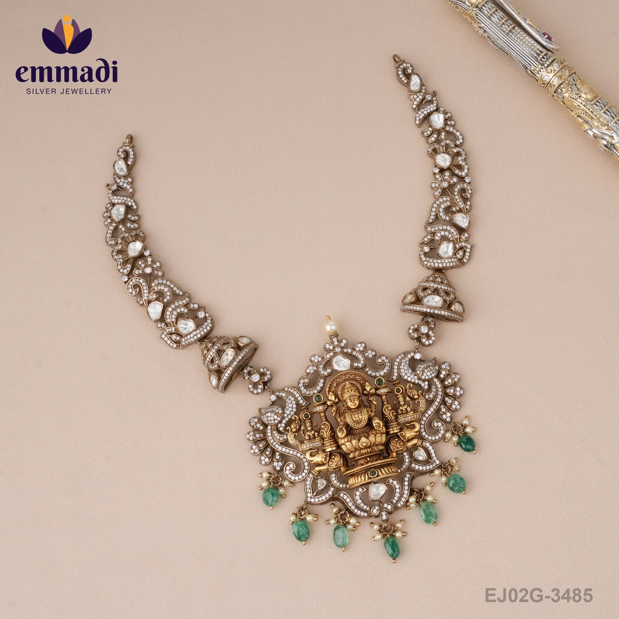 Indulge in the timeless elegance of the Sun?ta Victorian Green Kanty, a masterpiece crafted by Emmadi Silver Jeweller, India's Largest silver brand. This exquisite piece effortlessly blends Victorian charm with a hint of regal green, exuding a luxurious aura that captivates all who behold it. Elevate your style and grace with this striking jewellery that whispers sophistication and opulence with every shimmer. Revel in the allure of the past while making a bold statement in the present. A true treasure for those who appreciate fine craftsmanship and impeccable design.
