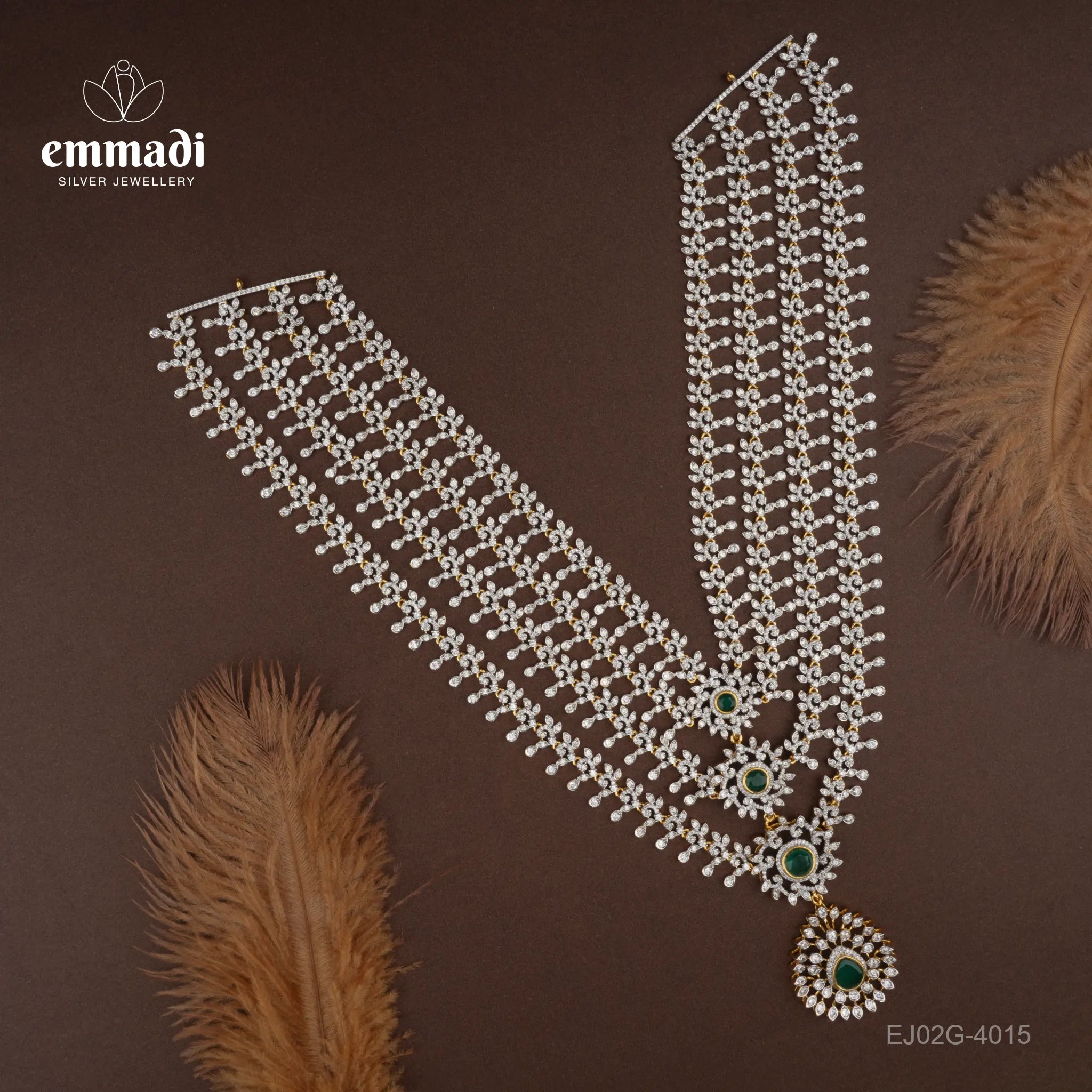 Indulge in the elegance of the Vrunda Premium Cz Green Long Necklace, a breathtaking masterpiece crafted for those who appreciate the finer things in life. Radiating with sophistication and charm, this exquisite piece effortlessly adds a touch of glamour to any ensemble. Handcrafted by Emmadi Silver Jeweller, India's Largest silver brand, it is a true symbol of luxury and style. Elevate your look with this stunning necklace and bask in the allure of timeless beauty.