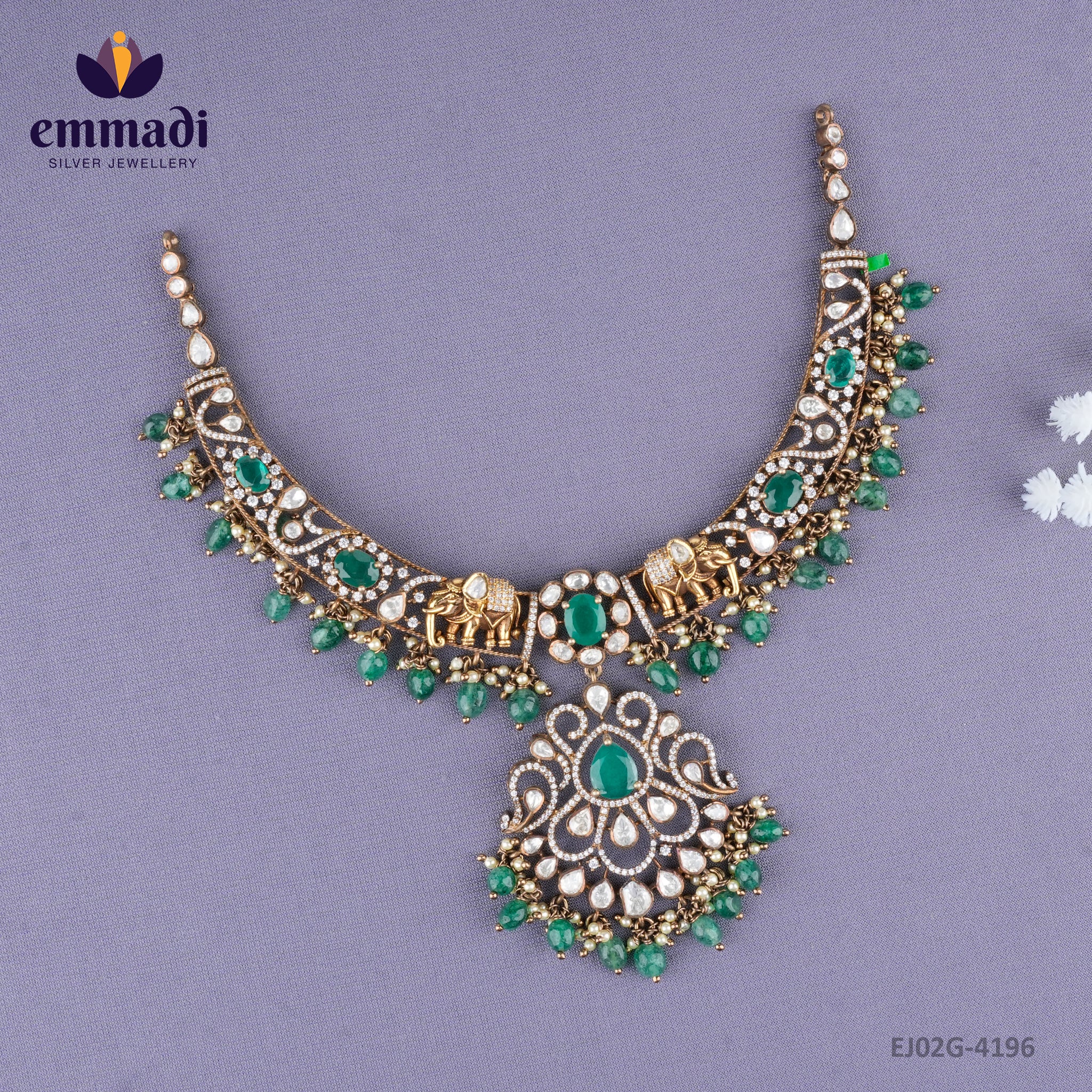 Indulge in opulence with the Ajeitha Victorian Green Necklace, a stunning masterpiece crafted by Emmadi Silver Jeweller, India's Largest silver brand. Elevate your look with this exquisite piece that exudes elegance and sophistication. Adorn yourself with the rich green hues of this necklace, a symbol of luxury and prestige. Make a statement with the Ajeitha Victorian Green Necklace - a true embodiment of grandeur and style.