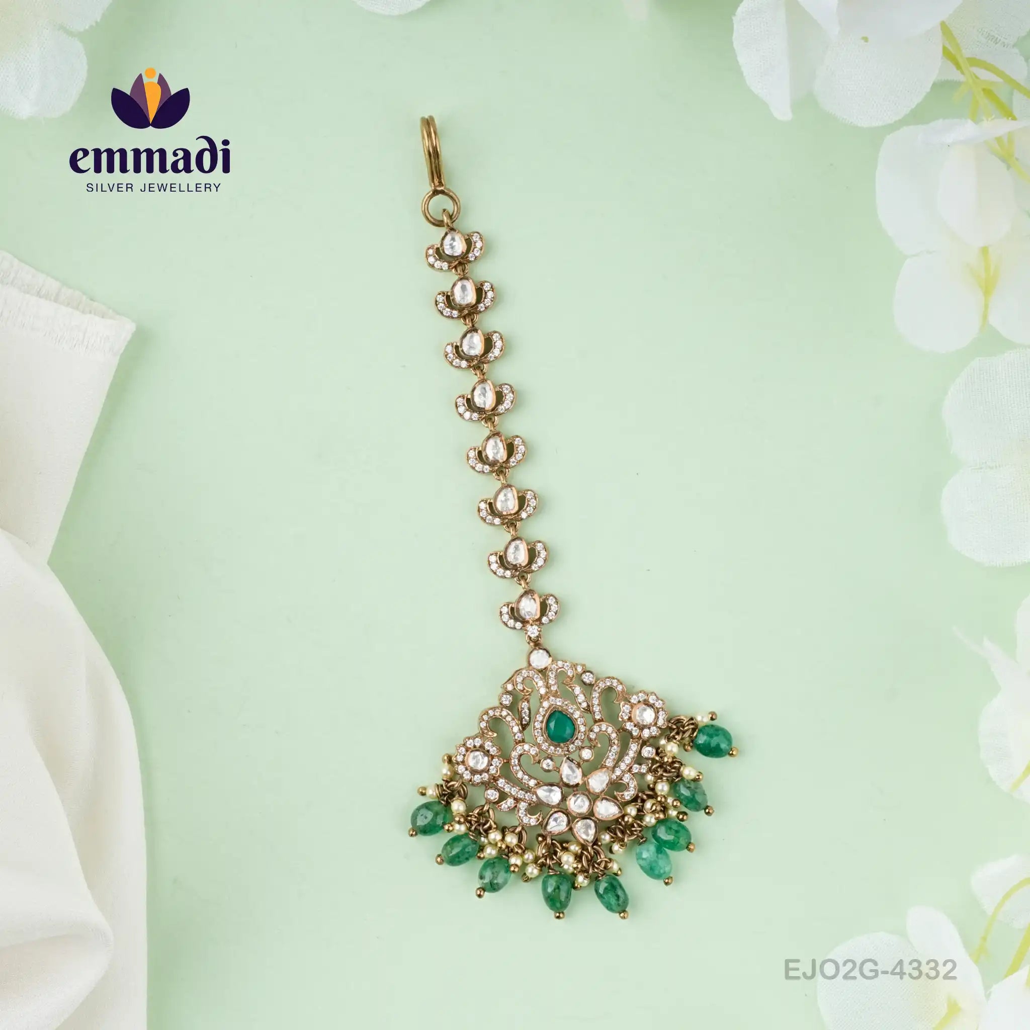Indulge in the epitome of elegance and grace with the Atheeva Victorian Green Papidi Billa. Crafted to perfection by Emmadi Silver Jeweller, India's Largest silver brand, this exquisite piece exudes an air of regality and sophistication. Let your style speak volumes with this timeless accessory that effortlessly adds a touch of opulence to any ensemble. Illuminate your look with the mesmerising charm of the Victorian era, encapsulated in the stunning Green Papidi Billa. Redefine luxury.