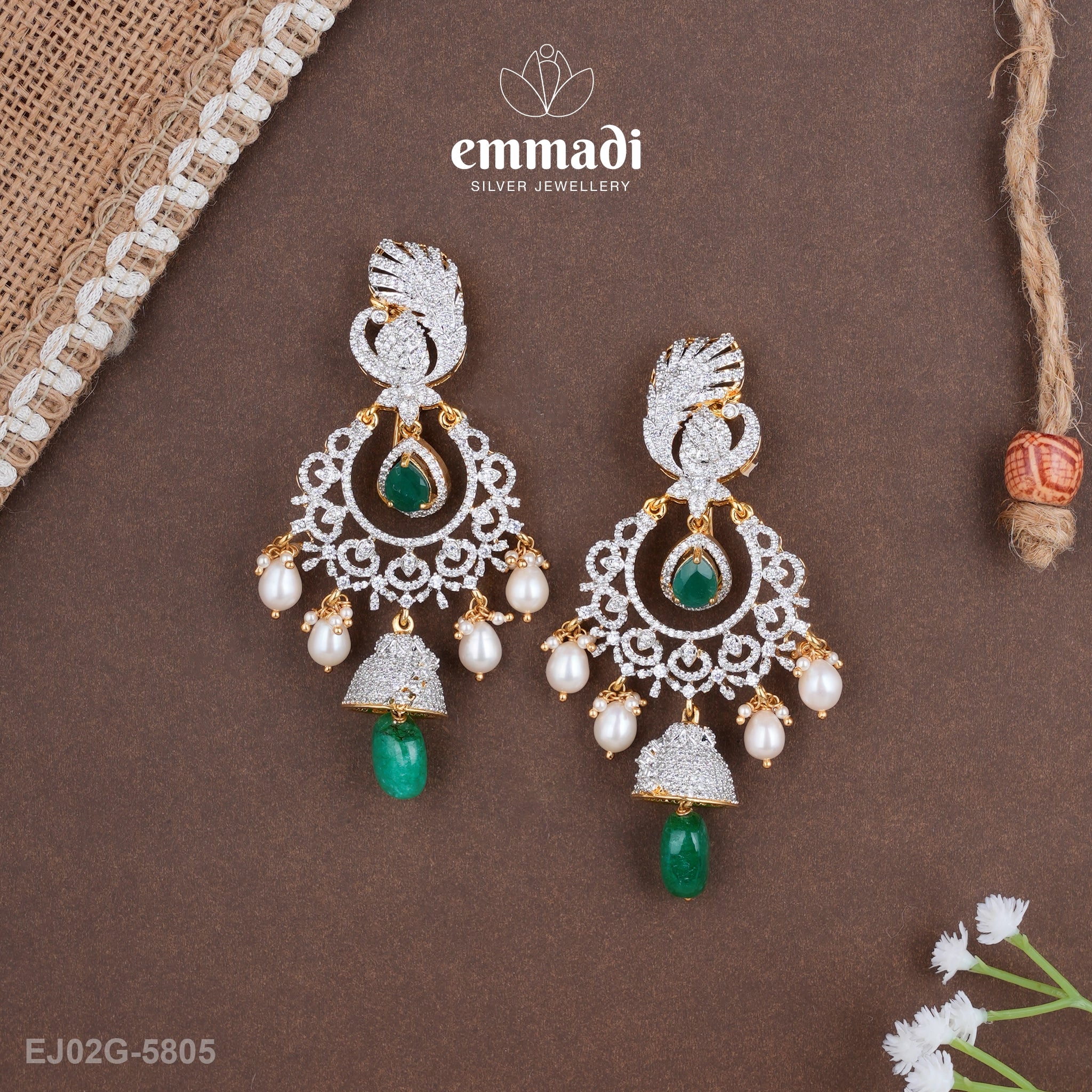 Indulge in the opulent elegance of Hareena Premium CZ Green Hangings by Emmadi Silver Jeweller, India's Largest silver brand. These captivating earrings exude sophistication and glamour, adorned with exquisite green cubic zirconia stones that shimmer with luxurious allure. Elevate your look with this stunning pair, perfect for adding a touch of sophistication to any outfit. Experience the beauty of timeless style with Hareena Premium CZ Green Hangings.