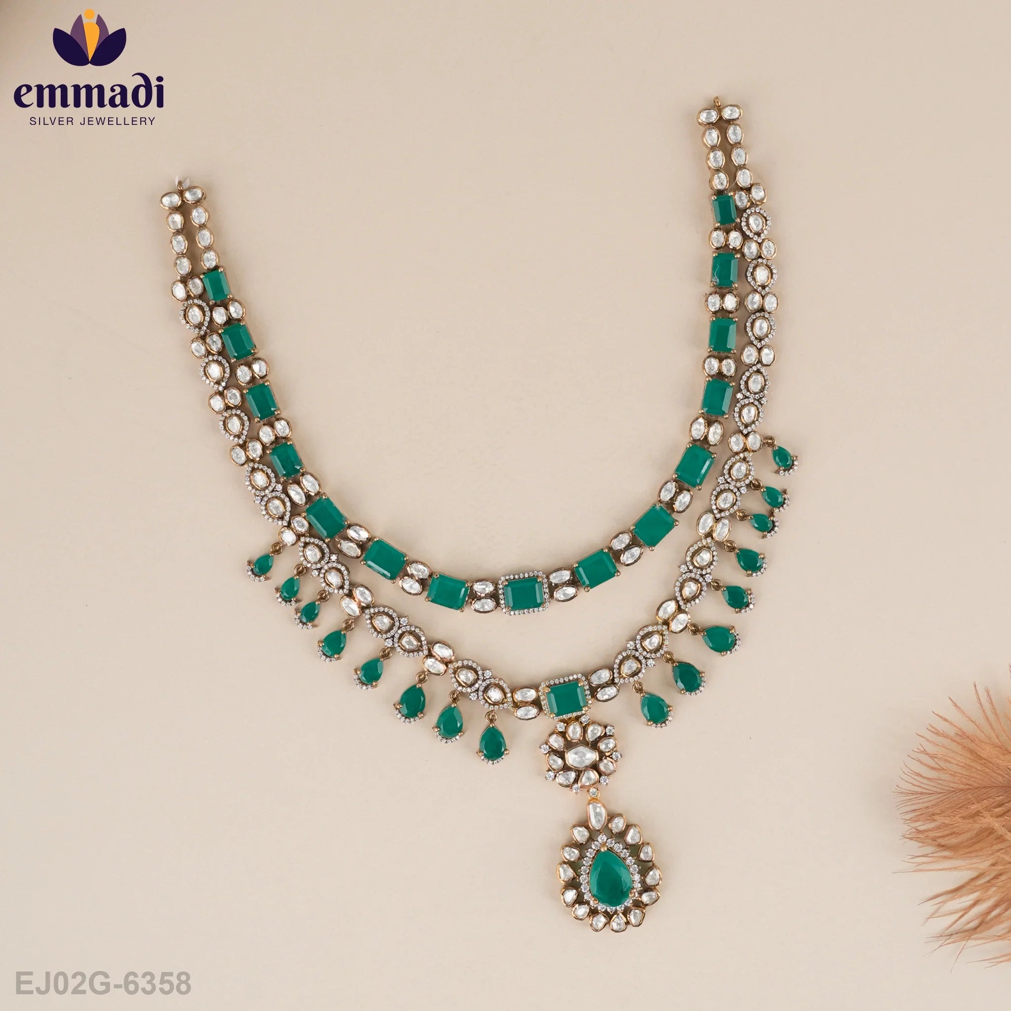 Indulge in the magnificent allure of the Jyostna Victorian Green Necklace by Emmadi Silver Jeweller, India's Largest silver brand. This exquisite piece exudes opulence and sophistication, making a bold statement of elegance. Adorn yourself with this timeless treasure and elevate your style to unparalleled levels of luxury. Immerse yourself in the splendour of tradition and beauty with the Jyostna Victorian Green Necklace.
