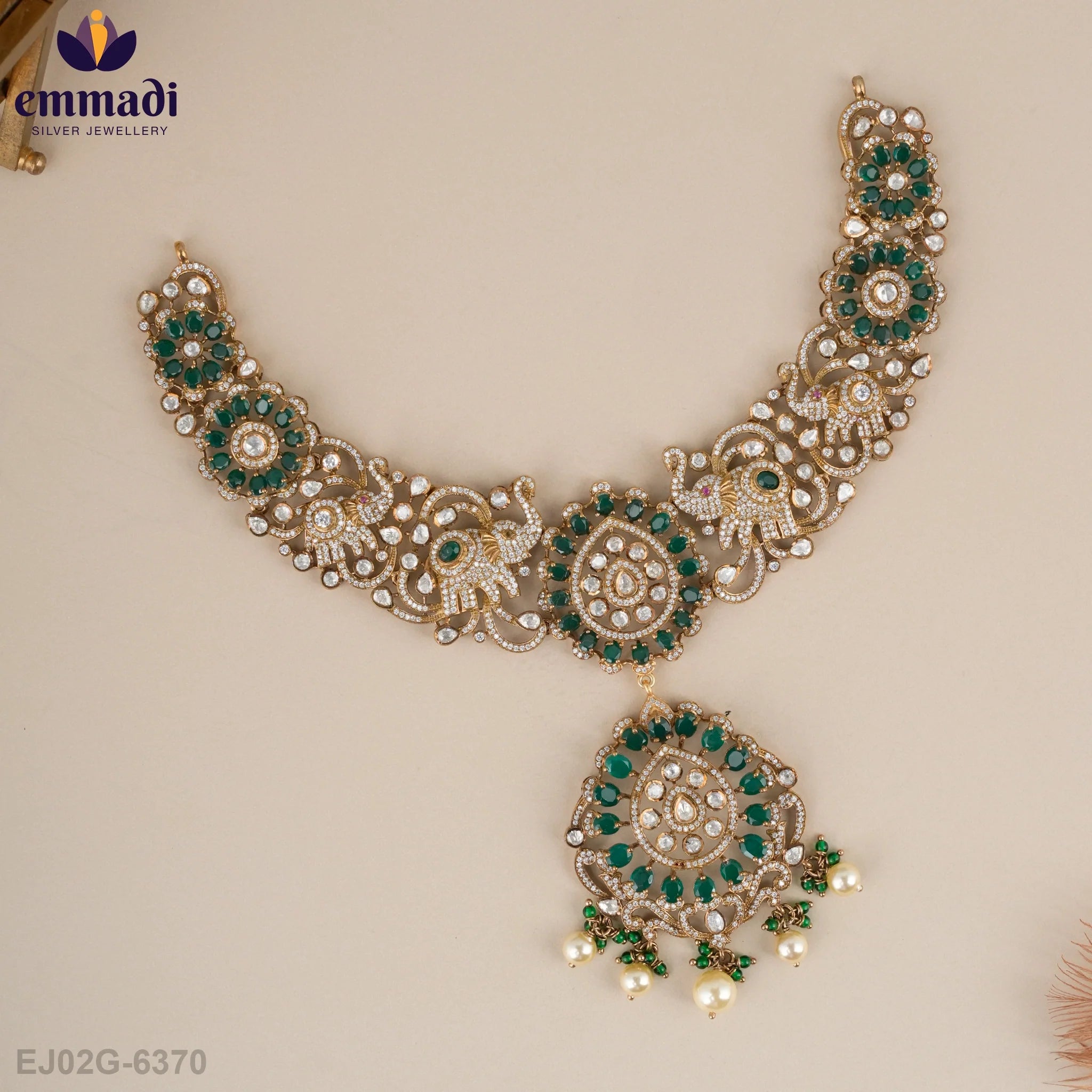 Indulge in the exquisite elegance of the Kalinda Victorian Green Necklace, a true masterpiece from Emmadi Silver Jeweller, India's Largest silver brand. ���� This stunning necklace exudes a timeless and luxurious charm, making it the perfect accessory for those who appreciate the finer things in life. Elevate your style with the regal green hues and intricate Victorian design of this remarkable piece. Make a statement like never before with the Kalinda Victorian Green Necklace - a symbol of opulence and sophistication.