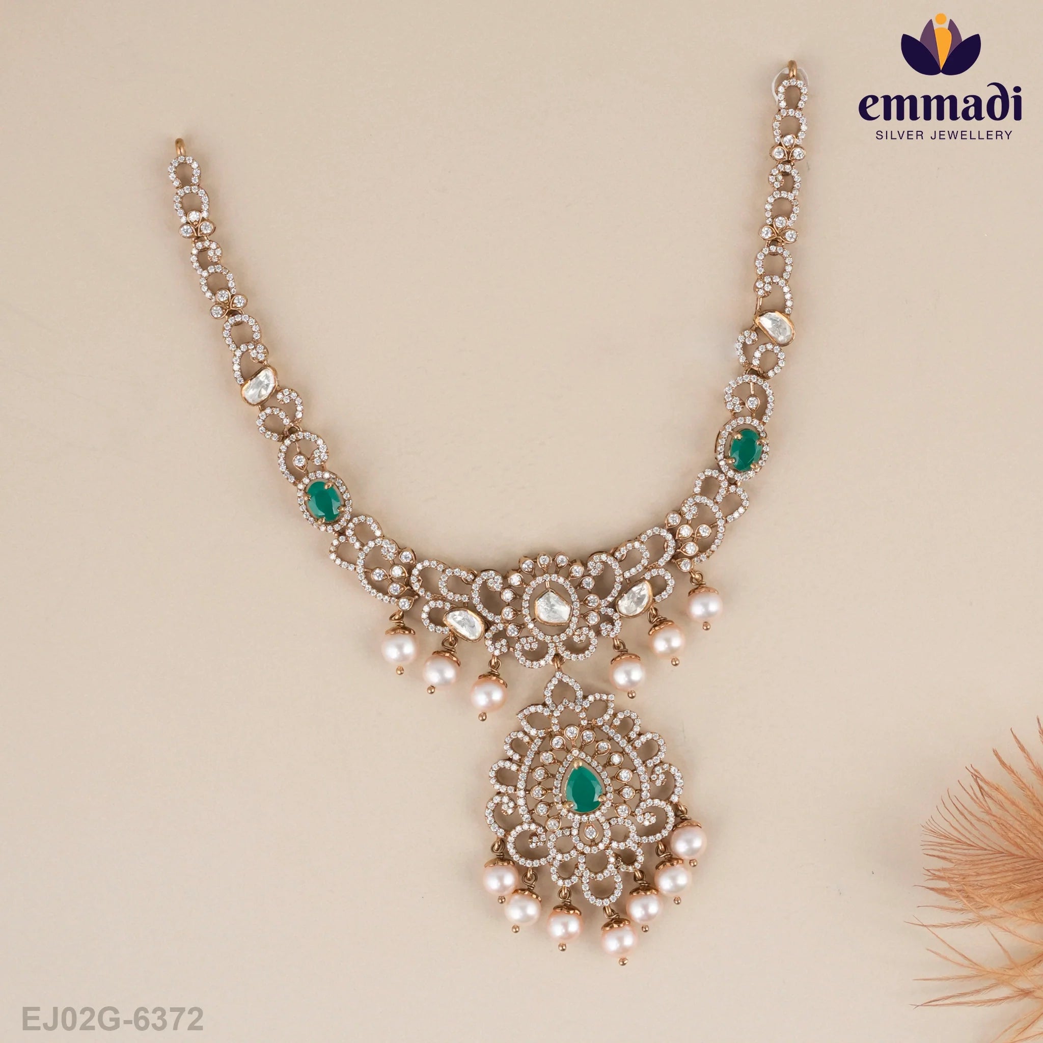 Indulge in the opulence of the Kalpaka Victorian Green Necklace, a true masterpiece from Emmadi Silver Jeweller, India's Largest silver brand. ���� This exquisite necklace exudes elegance and sophistication, making it the perfect accessory to elevate any outfit. Handcrafted to perfection, this statement piece features intricate details and a stunning green gemstone that exudes luxury. Add a touch of grandeur to your ensemble with the Kalpaka Victorian Green Necklace.