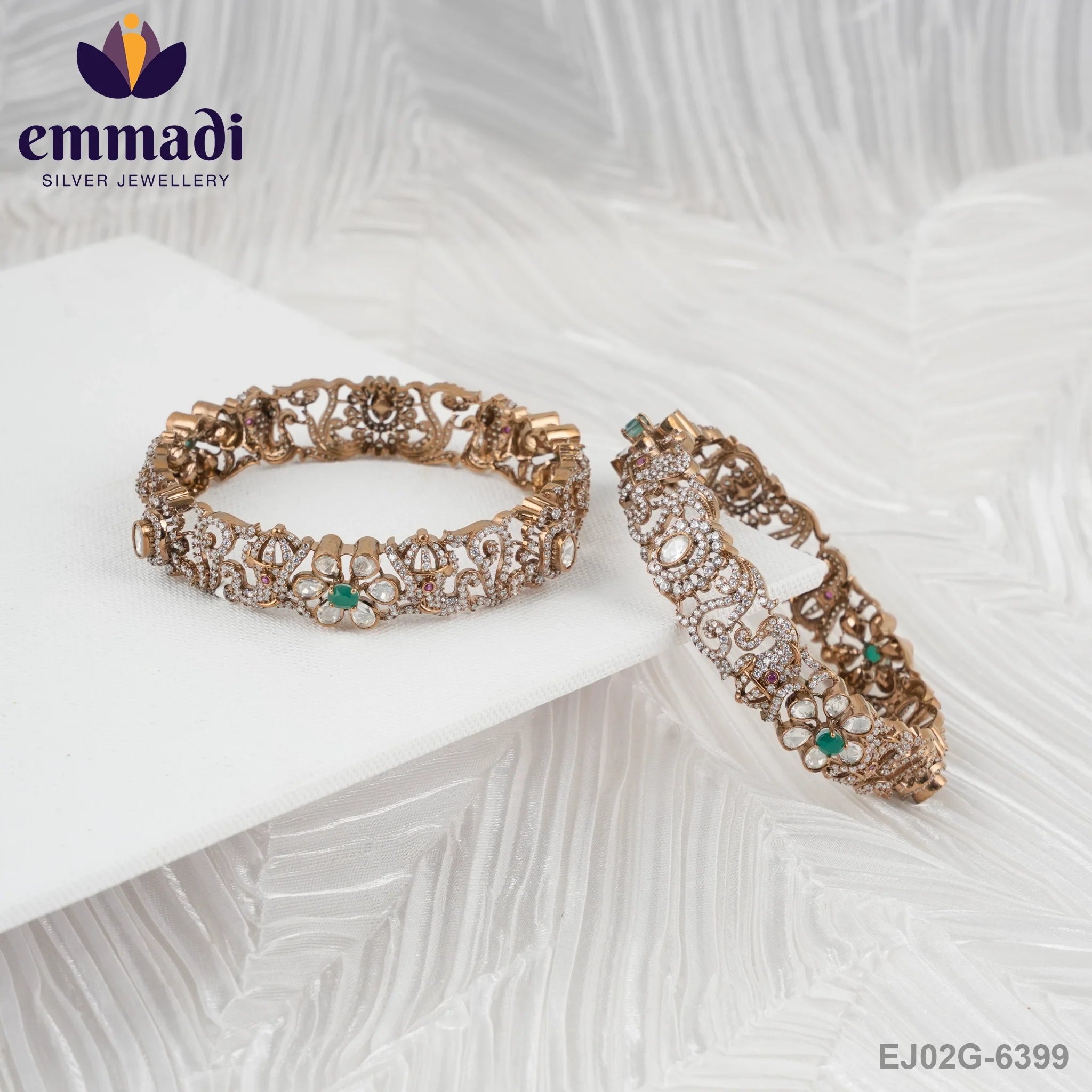 Indulge in the epitome of luxury with Emmadi Silver's exquisite Karmala Victorian Green Bangles. Elevate your allure with these opulent bangles, exuding sophistication and Victorian charm like no other. As the largest silver brand in India, Emmadi Silver ensures unparalleled quality and prestige with every piece. Adorn your wrists with a touch of grandeur, a timeless symbol of prestige perfect for glamorous occasions where your elegance speaks volumes. Let the Karmala Victorian Green Bangles be the exclusive accessory that exudes sophistication and luxury in every detail.