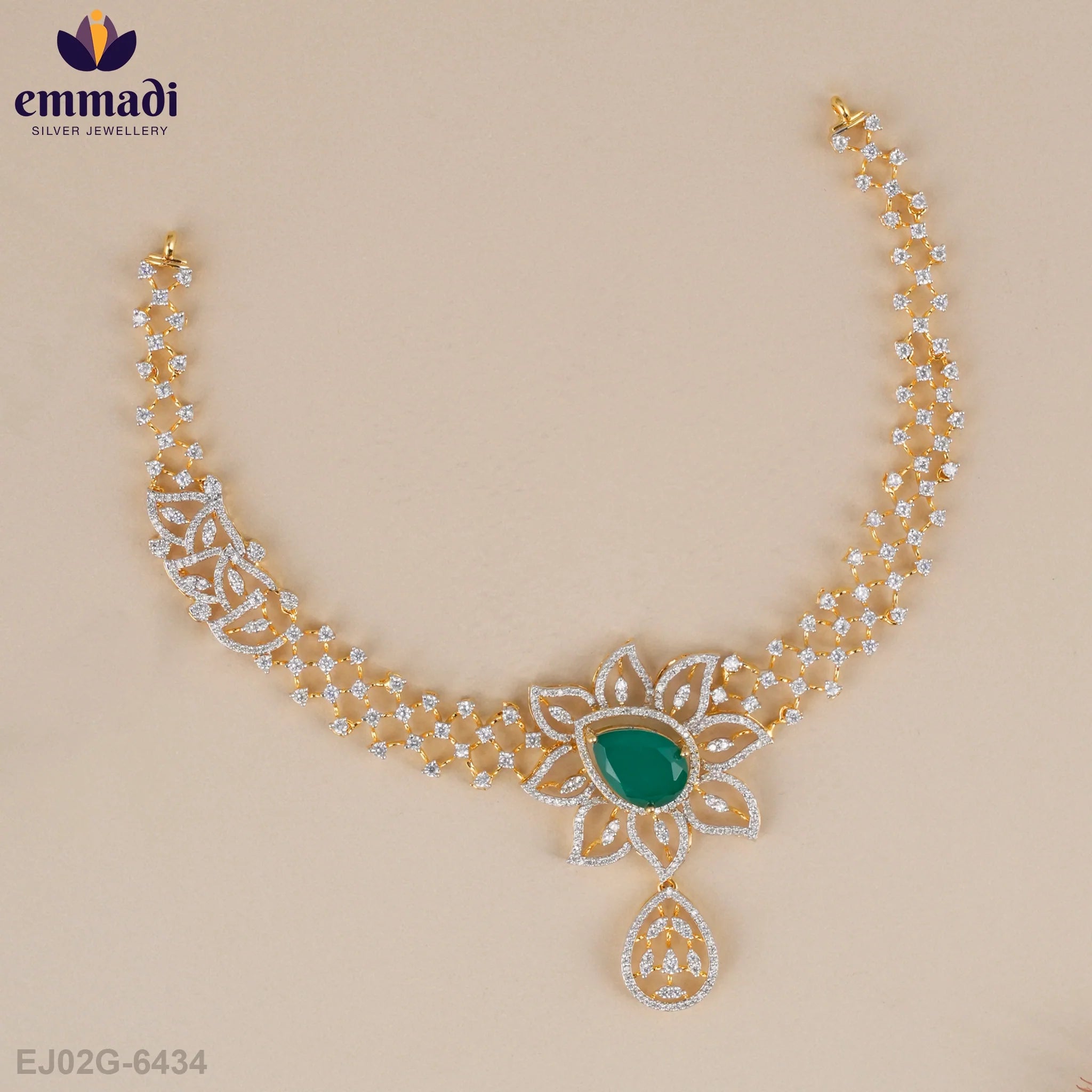 Indulge in the exquisite elegance of the Kushala Premium Cz Green Necklace, a stunning masterpiece crafted for those who appreciate luxury. Encrusted with dazzling cubic zirconia stones in a mesmerising green hue, this necklace exudes sophistication and glamour. Elevate your style with this exquisite piece from Emmadi Silver Jeweller, India's Largest silver brand.
