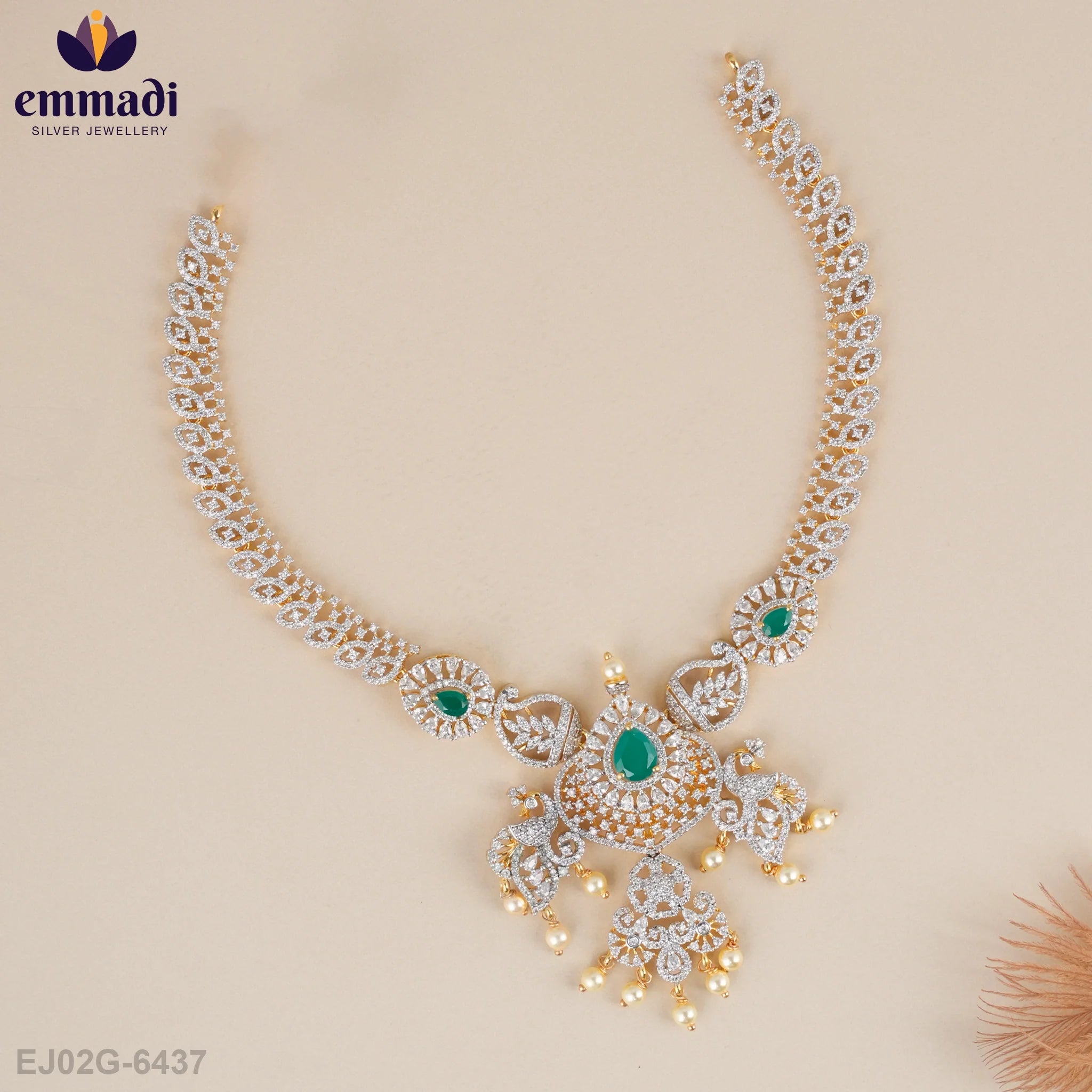 Indulge in the opulent beauty of the Labhaka Premium Cz Green Necklace by Emmadi Silver Jeweller, India's Largest silver brand. This exquisite piece radiates sophistication and luxury, making it a must-have accessory for those who appreciate fine craftsmanship. Elevate your ensemble with the dazzling allure of this stunning green necklace, and effortlessly make a statement of elegance and style.