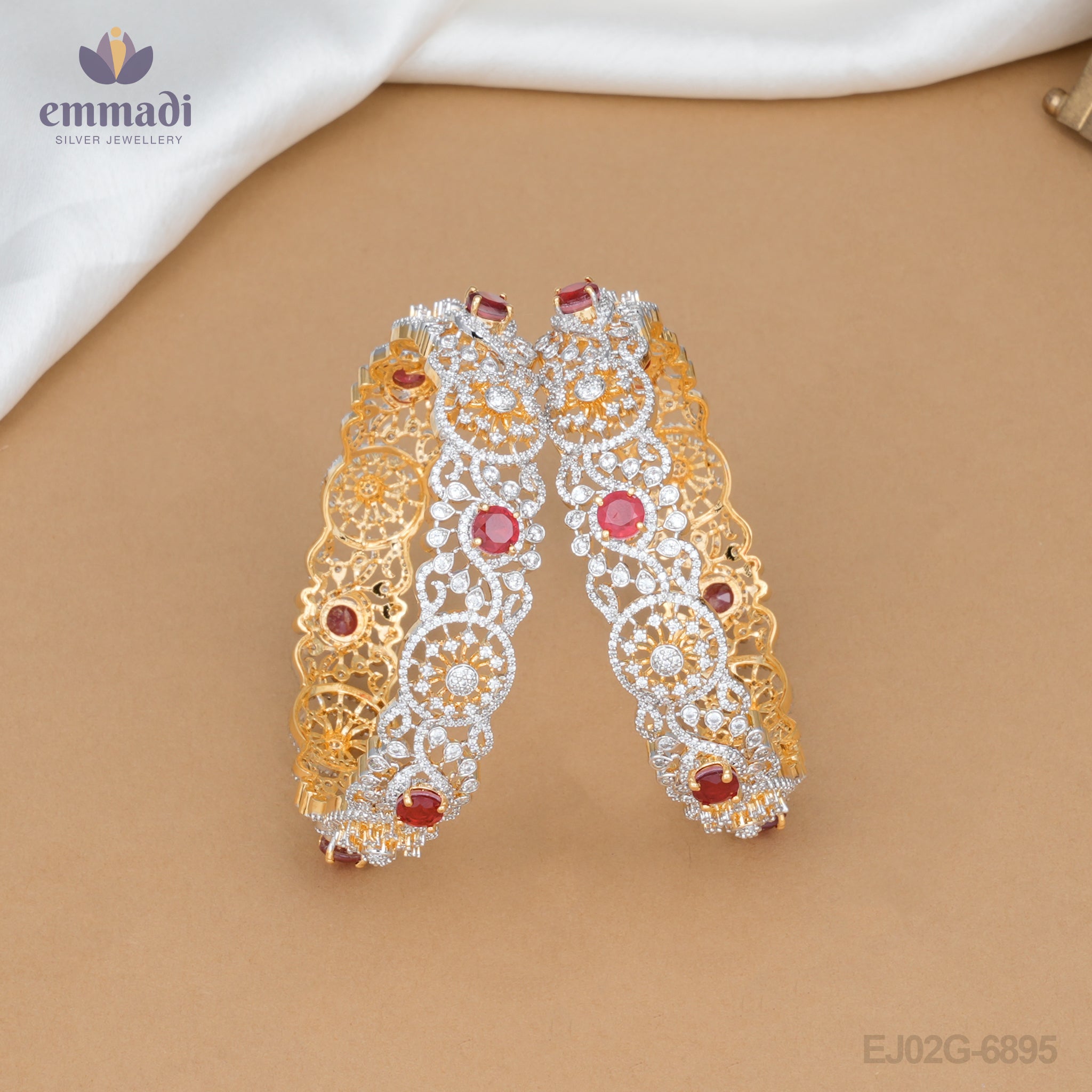 Elevate your style with our exquisite collection of Premium Red CZ Bangles from Sangeetha. These stunning bangles are crafted for those who appreciate the finer details in life, blending traditional elegance with contemporary design. Each bangle features high-quality, lab-created cubic zirconia stones that radiate brilliance and catch the eye, making them perfect for special occasions or everyday wear.