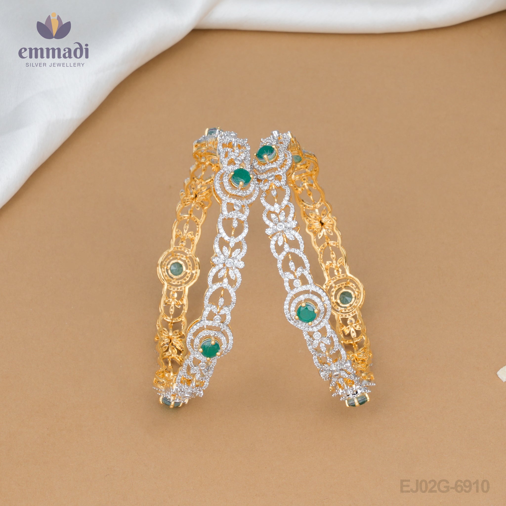 Elevate your jewelry collection with the exquisite Swathi Premium Green CZ Bangles, designed for the modern woman who appreciates elegance and style. These bangles are the perfect blend of sophistication and trend, making them an essential accessory for both everyday wear and special occasions. Each bangle features a stunning array of high-quality, glittering cubic zirconia (CZ) stones, intricately set to catch the light from every angle.