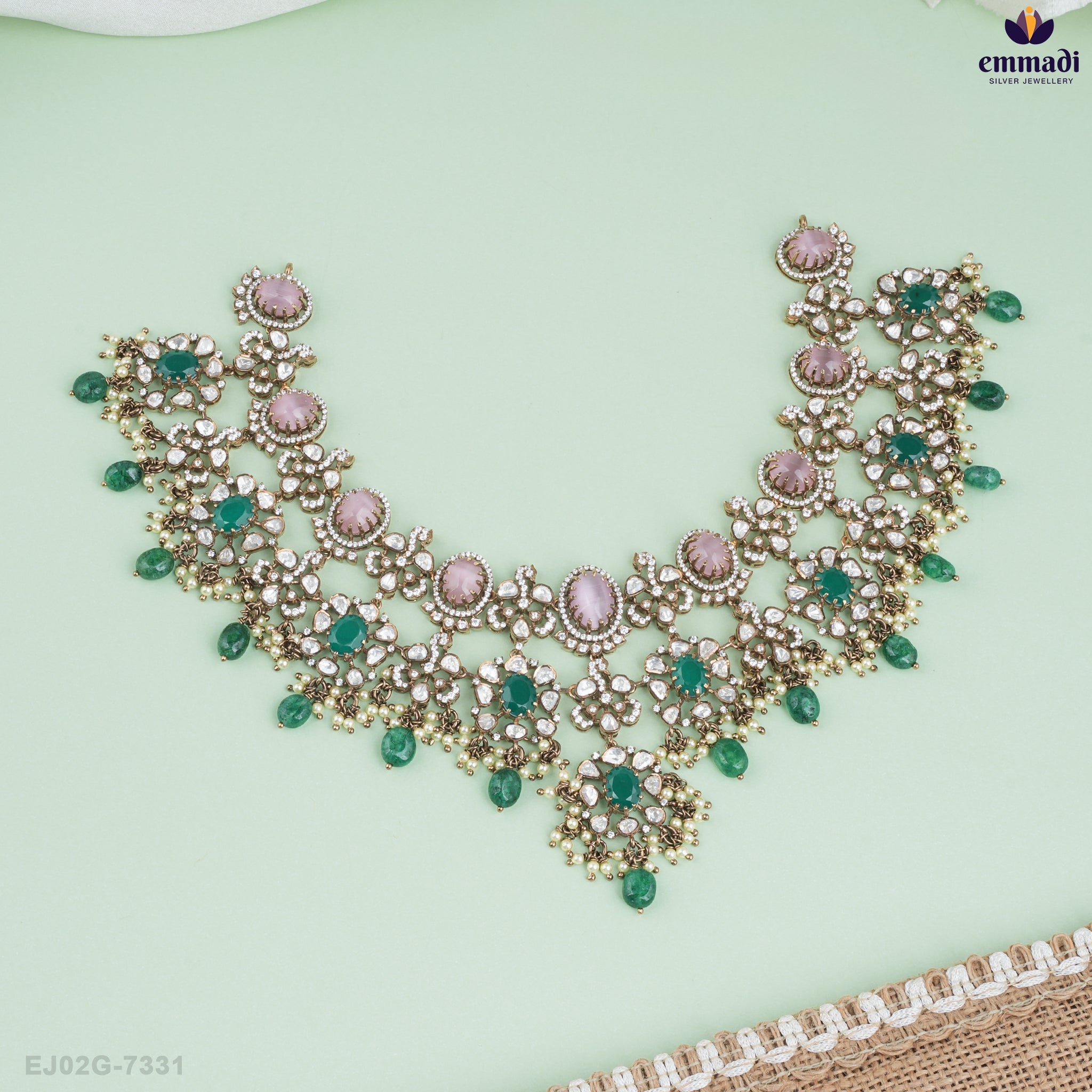 Discover the enchanting elegance of the DHRITI Exquisite Victorian Green Necklace, a timeless piece that beautifully embodies the sophistication of Victorian design. This necklace features intricate filigree detailing, showcasing meticulous craftsmanship that is both delicate and captivating.