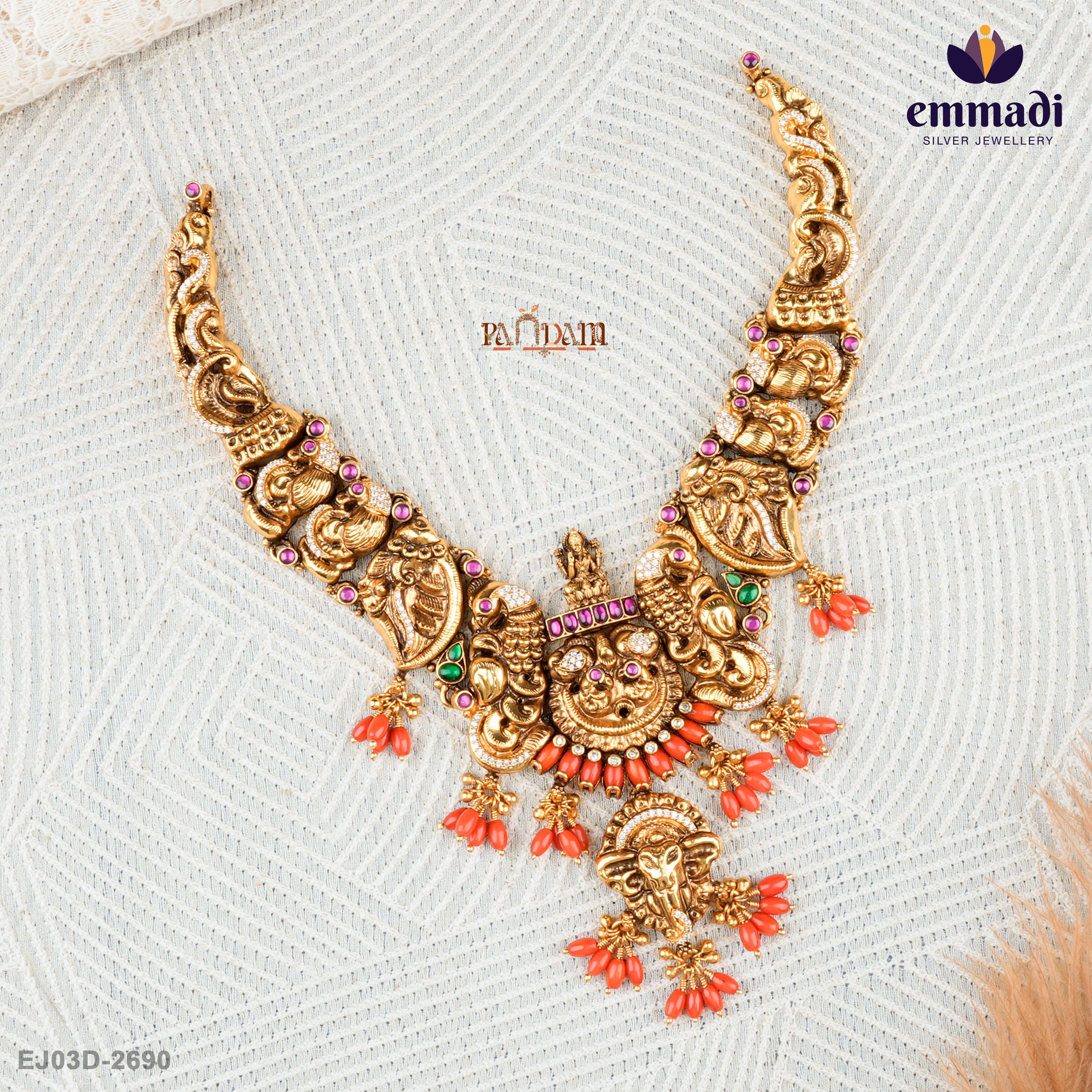 Our Nakshi Necklace is adorned with vibrant corals that add a splash of colour and uniqueness to the overall design. The multi-hued corals harmoniously blend with the silver base, creating an eye-catching contrast that ensures this necklace stands out in your collection. Each piece is handcrafted, reflecting exceptional artistry and dedication to quality, making it a perfect accessory for both daily wear and special events.