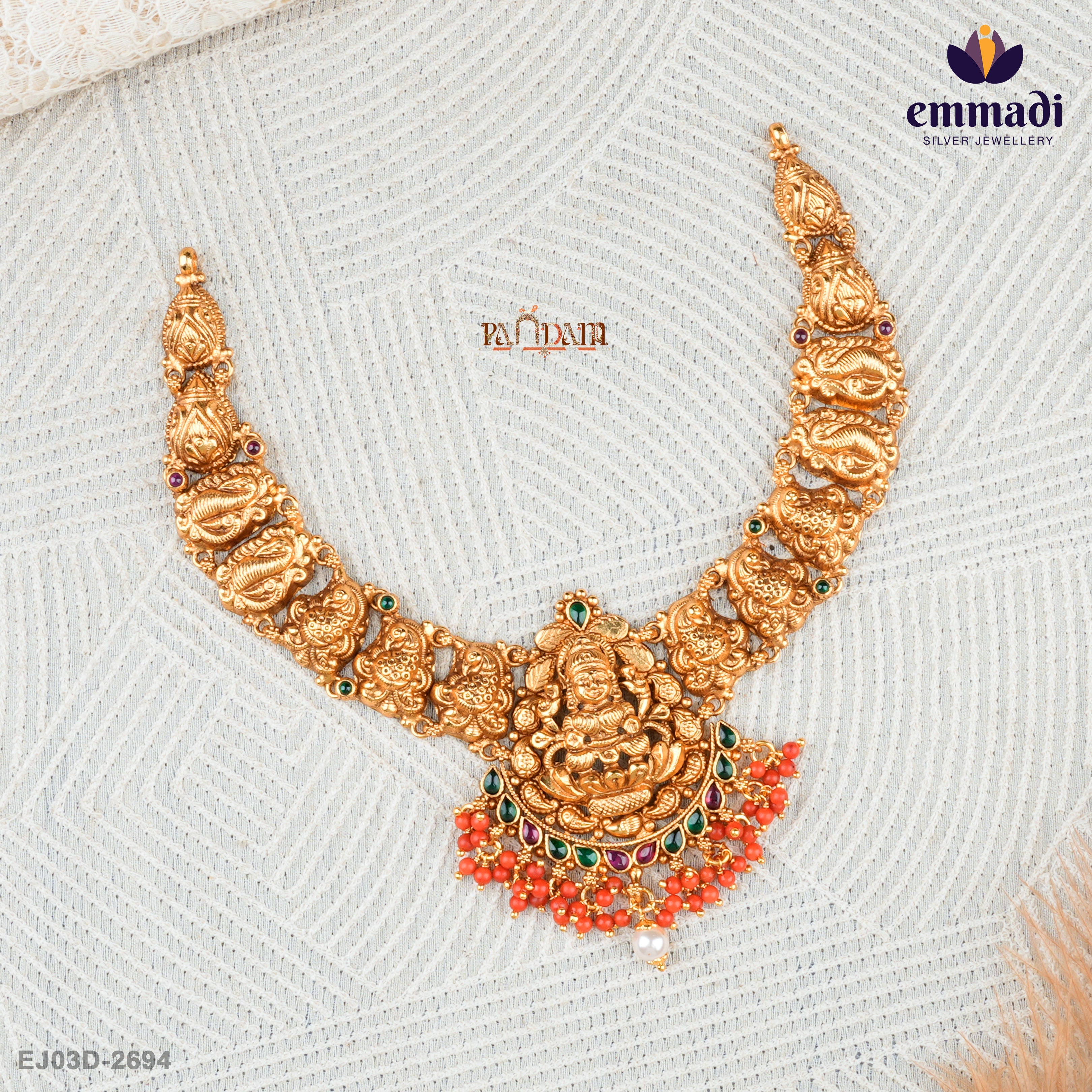 Introducing the exquisite Bhuri Pagadam Necklace Nakshi, a stunning representation of traditional craft and modern elegance. This unique necklace features intricate nakshi work, a time-honored artistic technique that brings a sense of heritage and craftsmanship to your jewelry collection.
