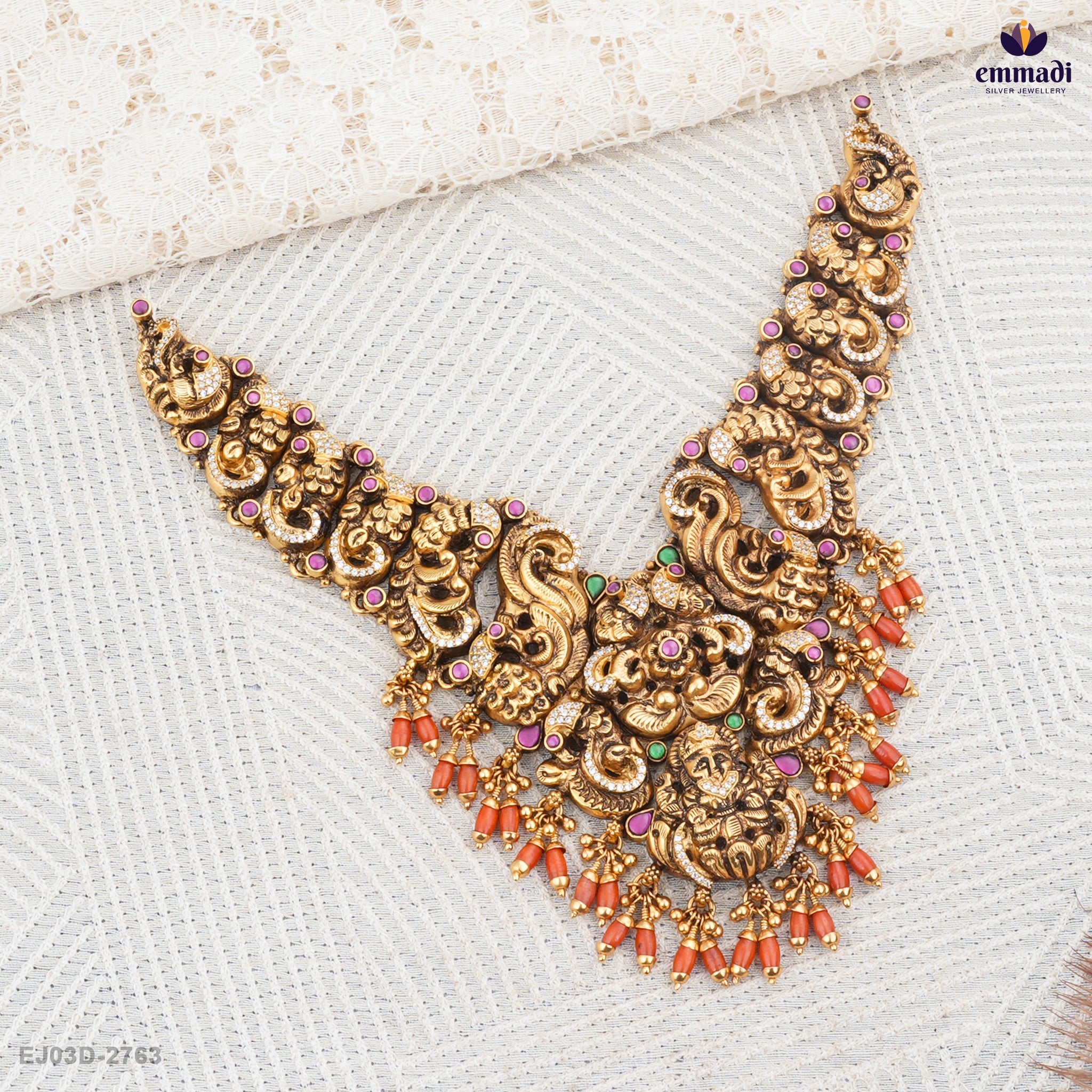 Introducing our exquisite Ashanjali Pagadam Necklace Nakshi, a stunning addition to our silver jewellery collection. This piece showcases the artistry of traditional nakshi craftsmanship, highlighting intricate designs that embody cultural heritage and elegance. Designed with vibrant multi-colored corals, this necklace adds a splash of color to any outfit, making it perfect for both festive occasions and everyday wear.