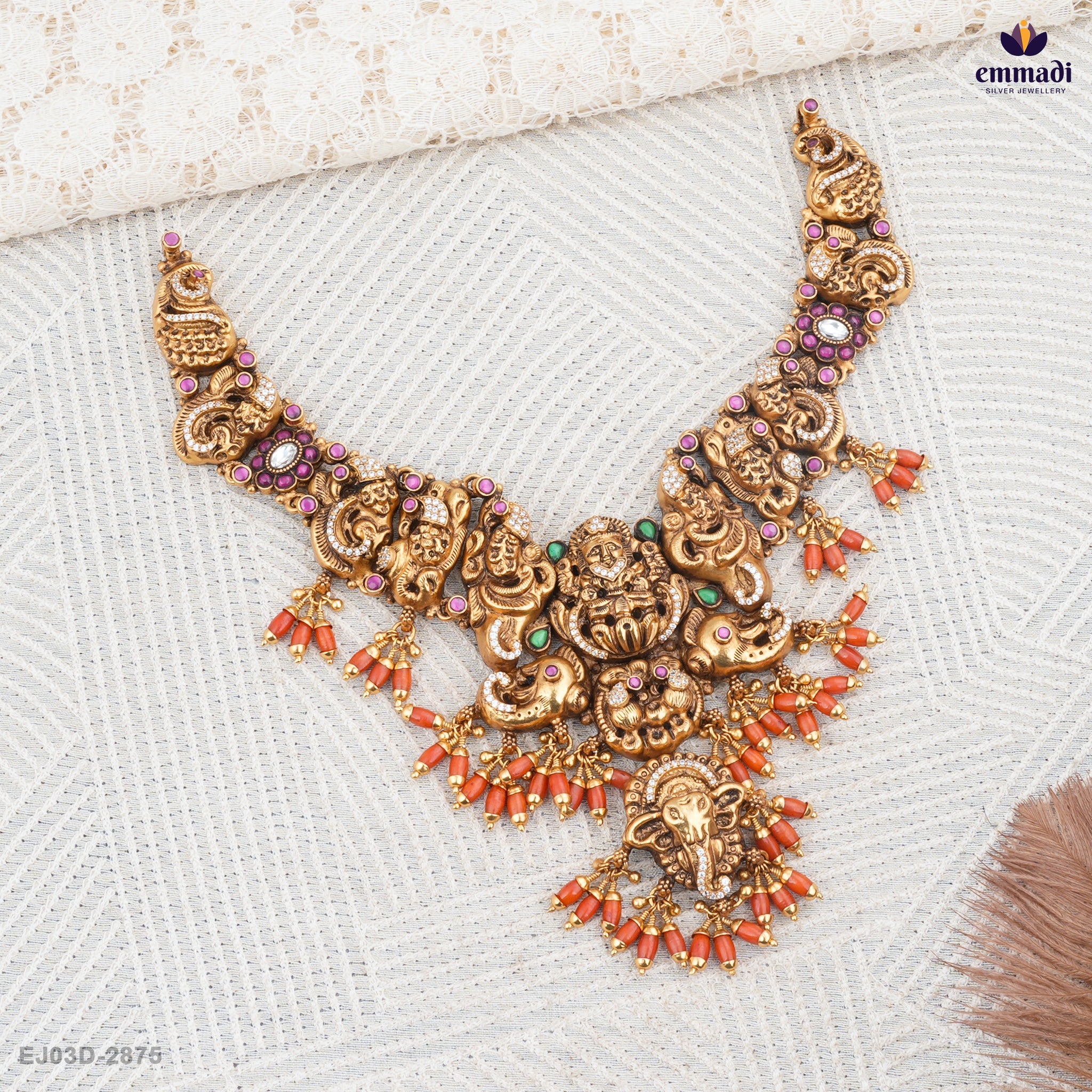 Crafted with attention to detail, this necklace is a true representation of cultural artistry and skilled craftsmanship. The combination of nakshi work and coral embellishments reflects a rich heritage while embracing contemporary style. With a comfortable clasp closure, the necklace ensures a secure fit, allowing you to wear it with confidence.