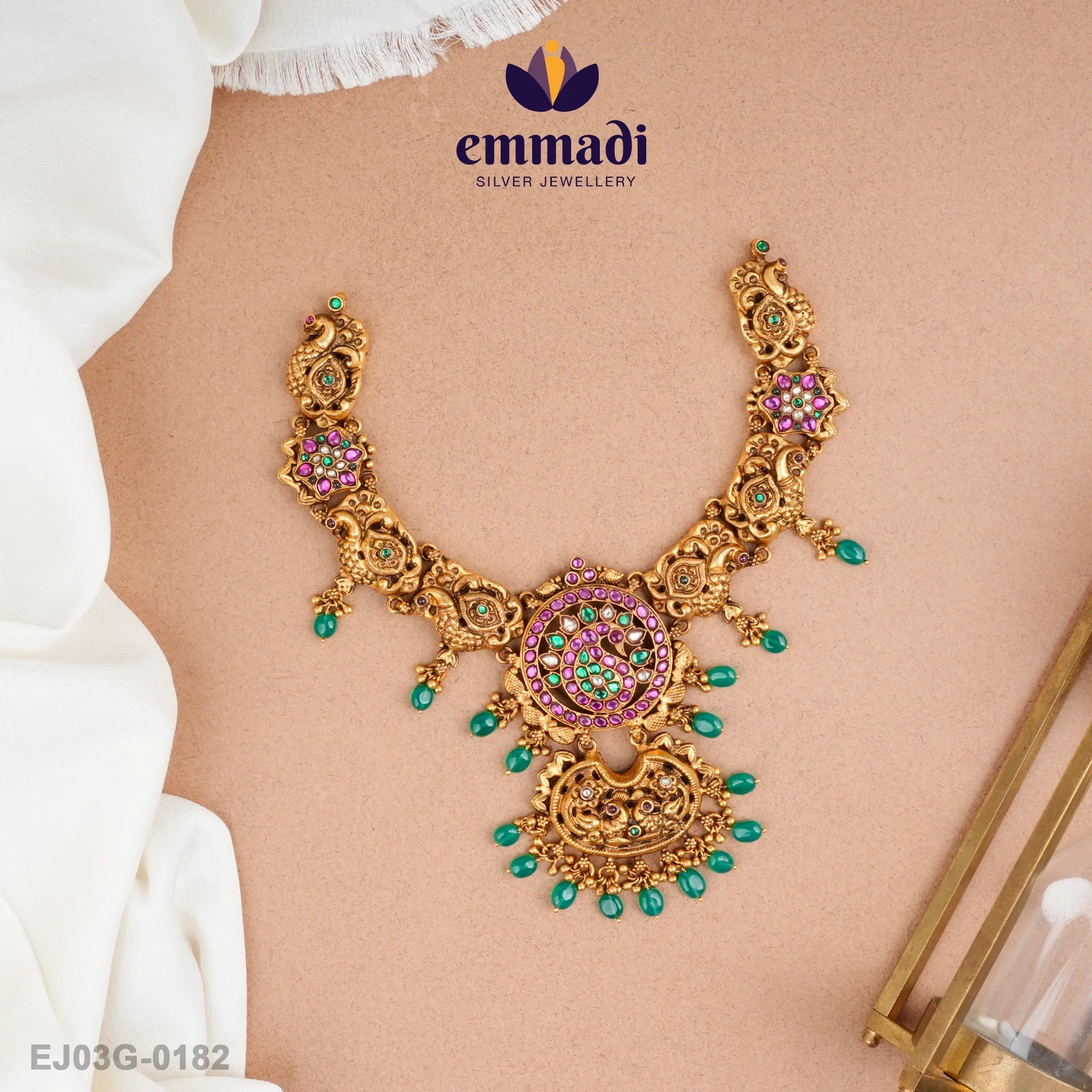 Indulge in the exquisite beauty of the Nehitha Kundan Nakshi Multi Necklace by Emmadi Silver Jeweller, India's Largest silver brand. Crafted with precision and elegance, this necklace radiates luxury and sophistication, making it a must-have statement piece for your collection. Elevate your style and showcase your impeccable taste with this stunning masterpiece. Unleash your inner glamour with the mesmerising allure of Nehitha.