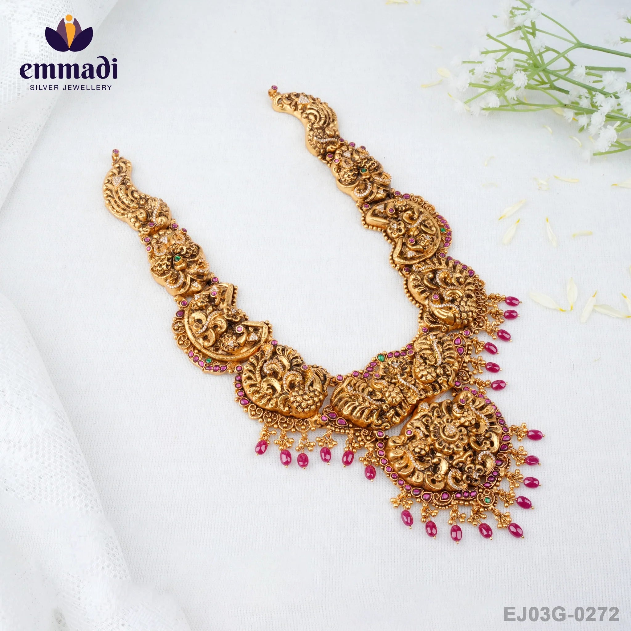Indulge in the opulence of the Padmaja Kundan Nakshi Multi Long Necklace, a masterpiece from Emmadi Silver Jeweller, India's Largest silver brand. Crafted with exquisite artistry, this necklace exudes elegance and sophistication for the woman who appreciates luxury. Elevate your style and make a statement with this stunning piece that adds a touch of glamour to any outfit. Experience the allure of traditional craftsmanship combined with contemporary design. Enhance your ensemble with the timeless beauty of this magnificent necklace.