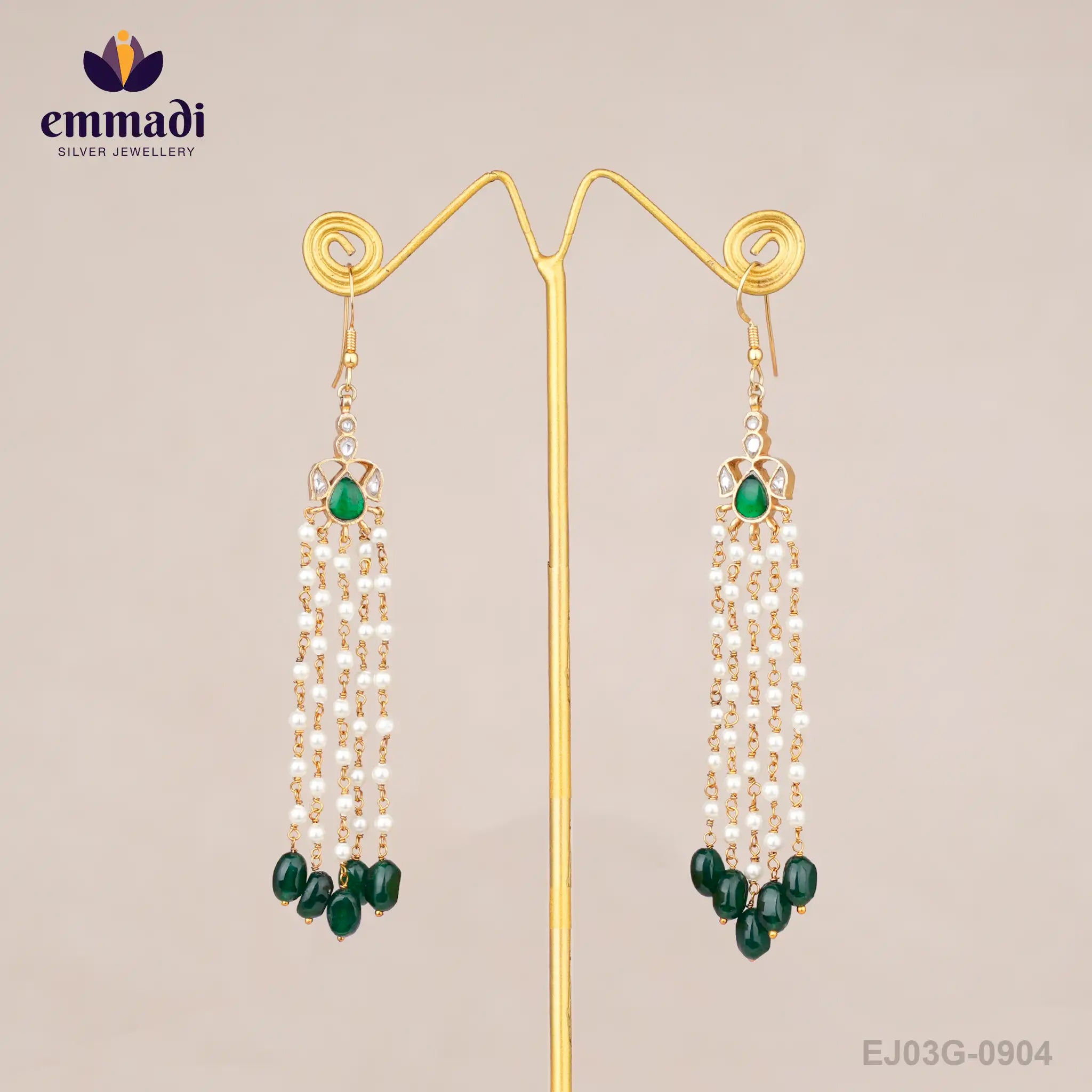Introducing the exquisite Rushita Kundan Green Hangings, a true masterpiece in luxurious jewellery. Crafted by Emmadi Silver Jeweller, India's Largest silver brand, these earrings are a stunning blend of elegance and sophistication. The captivating green Kundan stones exude opulence, making these hangings a must-have statement accessory for any discerning fashionista. Elevate your style with the regal charm of Rushita Kundan Green Hangings.