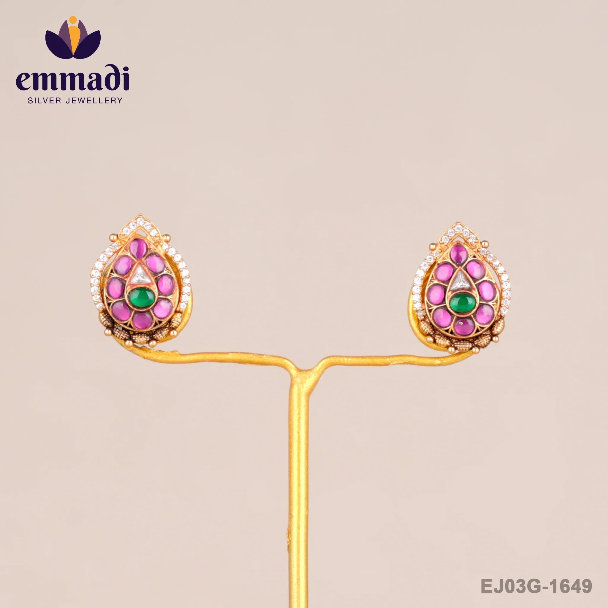 Indulge in the exquisite elegance of Sekhara Kundan Multi Studs, radiating sheer opulence and charm. Meticulously crafted by Emmadi Silver Jeweller, India's Largest silver brand, these studs are a symphony of luxury and sophistication. Elevate your style with these dazzling statement pieces that effortlessly blend tradition with contemporary allure. With Sekhara Kundan Multi Studs, embrace a world of timeless beauty and unmatched allure.