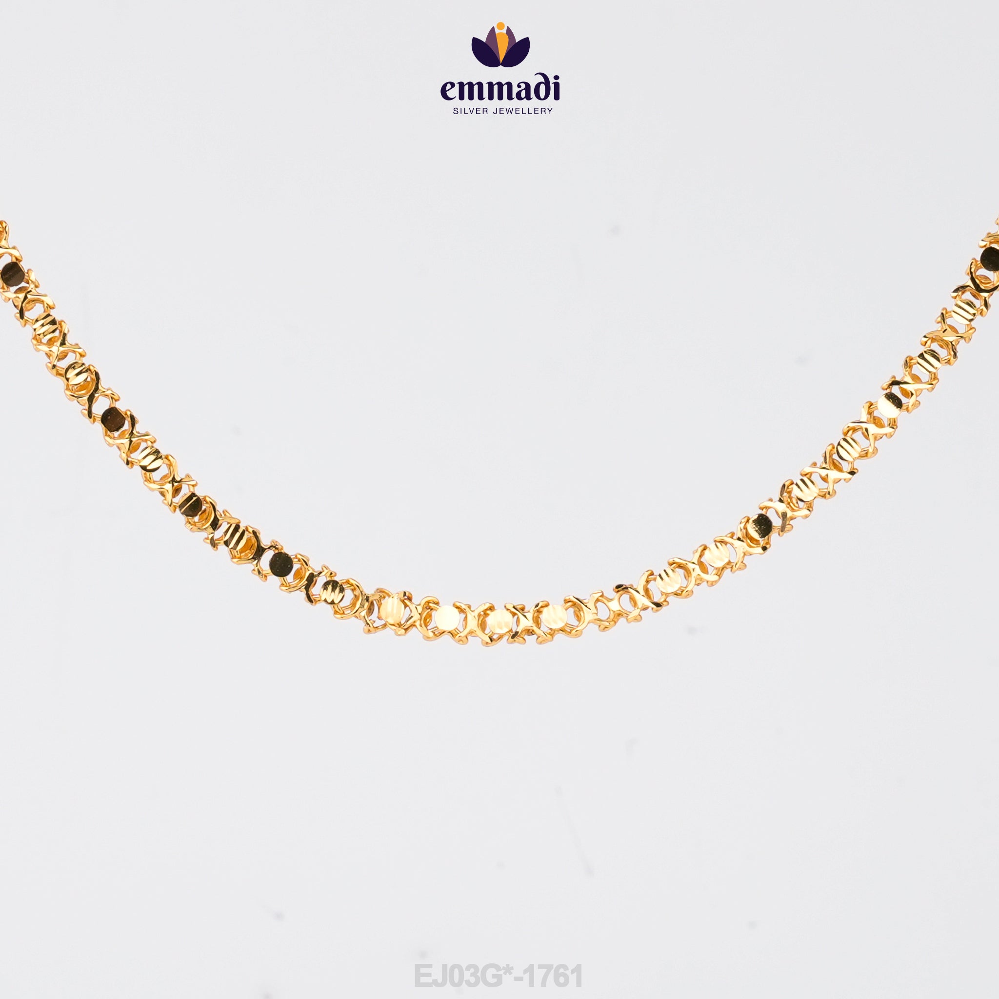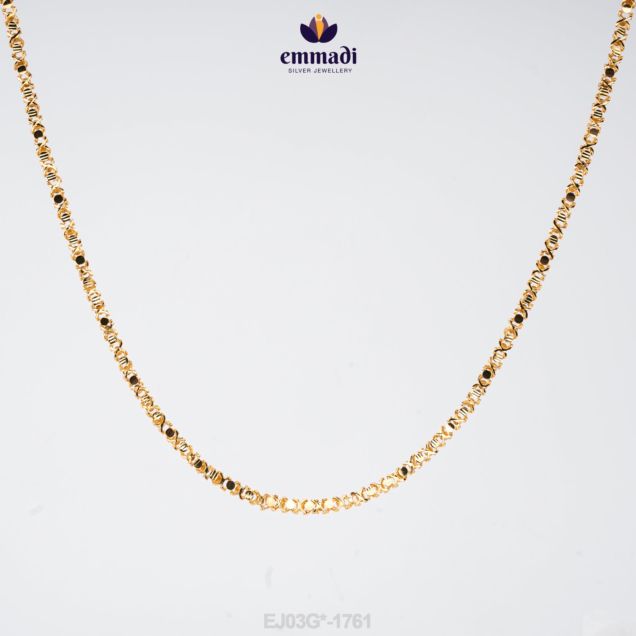 The design of the Jeeva gold chain is a harmonious blend of modern aesthetics and classic charm, featuring intricate links that interlace beautifully to create a unique pattern. This versatile piece effortlessly transitions from daytime casual to evening glamour. Whether paired with a simple blouse or an elegant dress, it enhances any outfit while adding a touch of luxury.