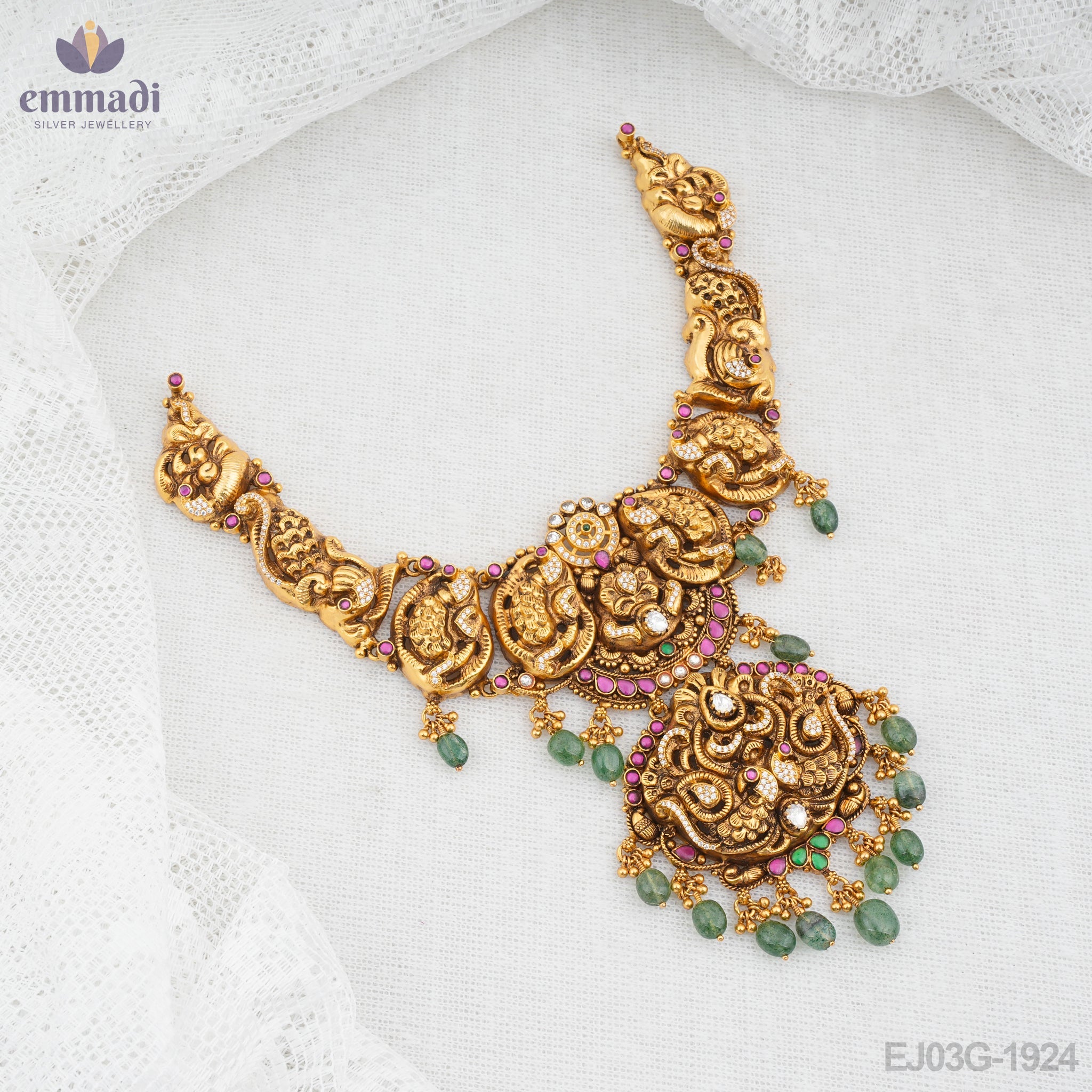 The necklace features a series of beautifully detailed Nakshi motifs that are harmoniously arranged to create a captivating visual appeal. Each design element is thoughtfully curated to reflect the artistry of skilled artisans, ensuring that every piece is unique. The warm gold hue enhances its opulence, adding a touch of luxe to any neckline.