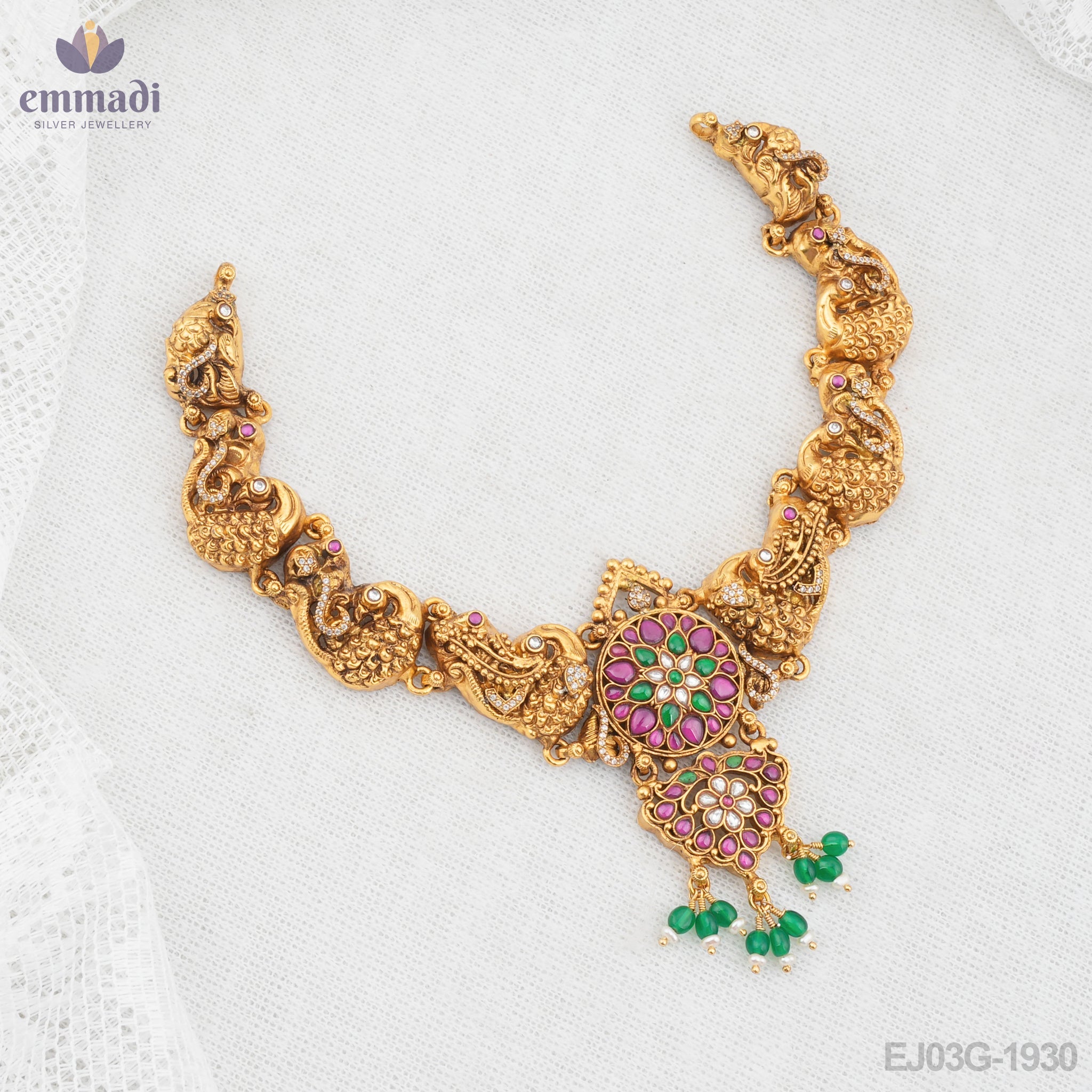 Introducing the Sadhana Divine Nakshi Gold Necklace, a timeless piece that embodies elegance and cultural significance. This exquisite necklace features traditional Nakshi craftsmanship, which is renowned for its intricate detailing and artistry. Expertly crafted from high-quality gold, this necklace is designed to capture the essence of heritage while offering a contemporary appeal.