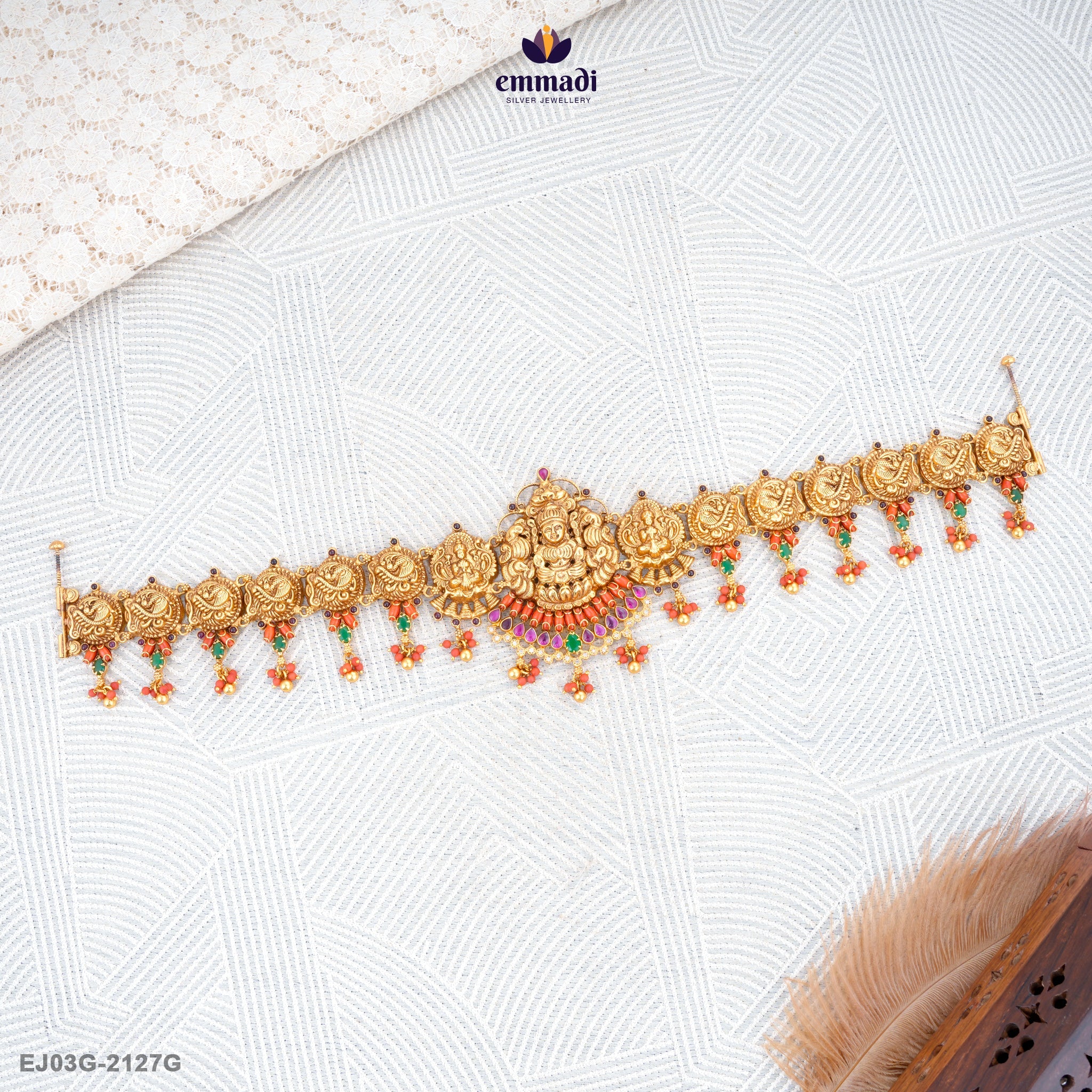 Crafted with precision, the Vaddanam Nakshi pieces are designed to be lightweight yet durable, ensuring comfort throughout the day. The multi-colored corals create a harmonious blend that captures the essence of femininity and grace, making it suitable for various outfits and occasions.
