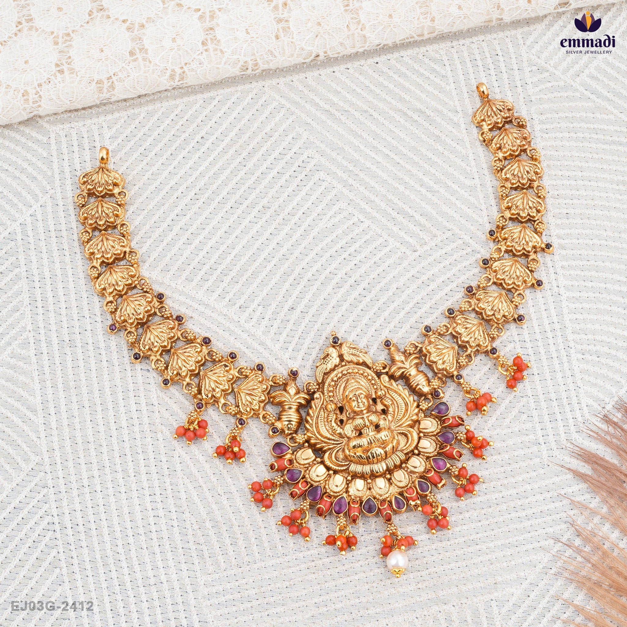 The necklace features a vibrant pink color that is accentuated by its unique design, making it an eye-catching accessory suitable for various occasions. Set against the delicate backdrop of corals, the necklace creates a harmonious balance of nature’s beauty and skilled craftsmanship. The corals are carefully selected to complement the Nakshi design, adding a pop of color and a touch of sophistication to your ensemble.