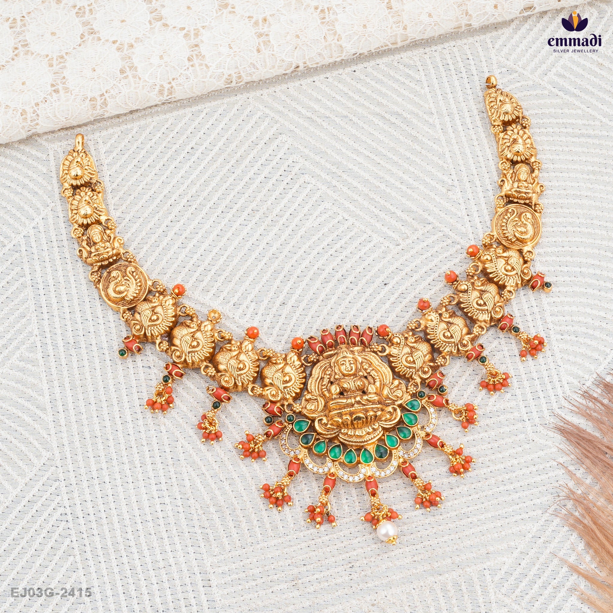 Introducing the stunning Pagadam collection, featuring the exquisite "Nakshi Necklace" adorned with vibrant green hues and striking coral accents. This necklace beautifully showcases the art of Nakshi craftsmanship, which is celebrated for its intricate designs and timeless appeal. The piece is crafted from high-quality materials and designed to exemplify elegance and sophistication.